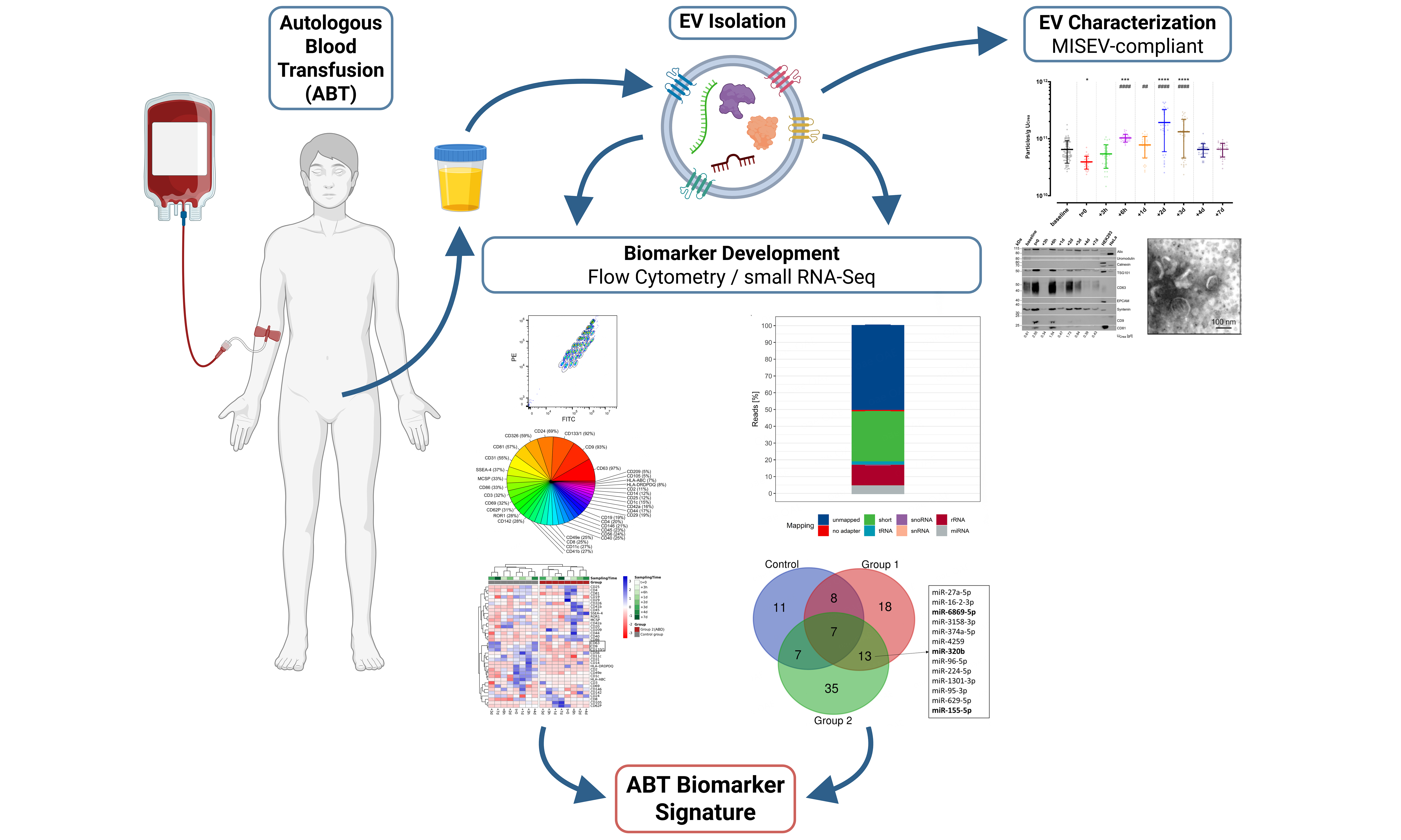 For this reason, current anti-doping research increasingly focuses on indirect detection of blood doping[6]. In initial investigations, analyzing an individual’s transcriptome appeared very promising to detect the misuse of growth-promoting substances or recombinant erythropoietin[9-12]. microRNAs (miRNAs), which are small 22-25 nucleotide long non-coding RNAs[13], are among the most promising biomarker candidates in this and other fields, such as oncology and cardiovascular research. Physiologically, they exert a great regulatory impact on more than 60% of the protein-coding gene set by repressing messenger RNA at the post-transcriptional level[14,15]. Interestingly, it has already been shown that erythrocytes contain a diversity of miRNAs, and that their miRNA profiles significantly change during storage[16-20]. In addition, erythrocyte storage increases the release of extracellular vesicles (EVs)[21,22], which are key intercellular communicators transferring a diverse cargo of bioactive compounds, including lipids, proteins, and various types of nucleic acids[23-27]. Vesicle-enclosed RNA is exceptionally well-protected from degradation and hence very promising in biomarker research[28-31]. Given their stability, accessibility via non-invasive procedures and sensitive quantification, miRNAs originating from urinary EVs (uEVs) have already been utilized for the detection of renal and urogenital diseases[32-35]. Despite the initial belief that EVs are too large for glomerular filtration, they were later shown to be eliminated via urine when reintroduced into the circulation[36,37]. However, the foregoing biomarker potential of uEV-miRNA has not yet been linked to reveal illegitimate ABT use in athletes.