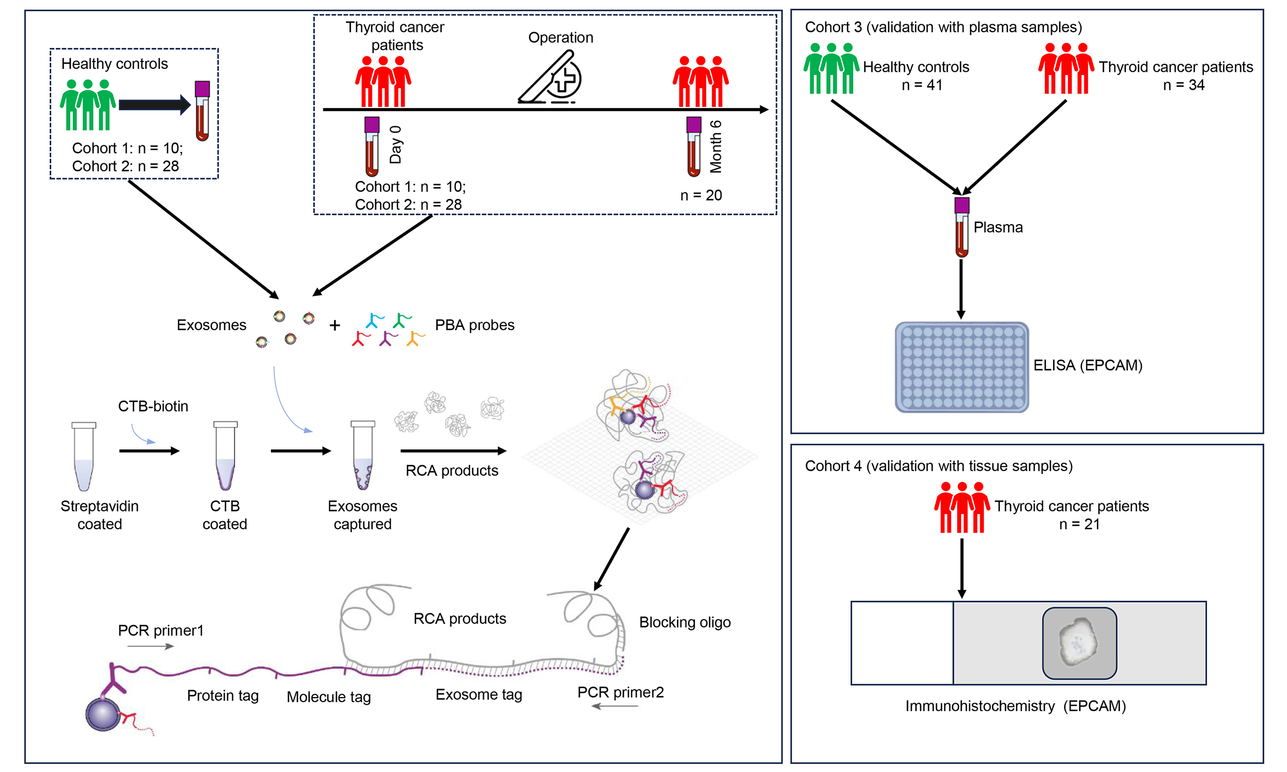 Methods: Plasma samples from TC and healthy controls (HC) were collected for a proximity-dependent barcoding assay (PBA) to identify plasma sEV biomarkers at the single-sEV level. We screened the potential biomarkers using the Panel260 (the panel that detects 260 proteins) of PBA in Cohort 1, and validated them using Panel550 (the panel that detects 550 proteins) in Cohort 2.