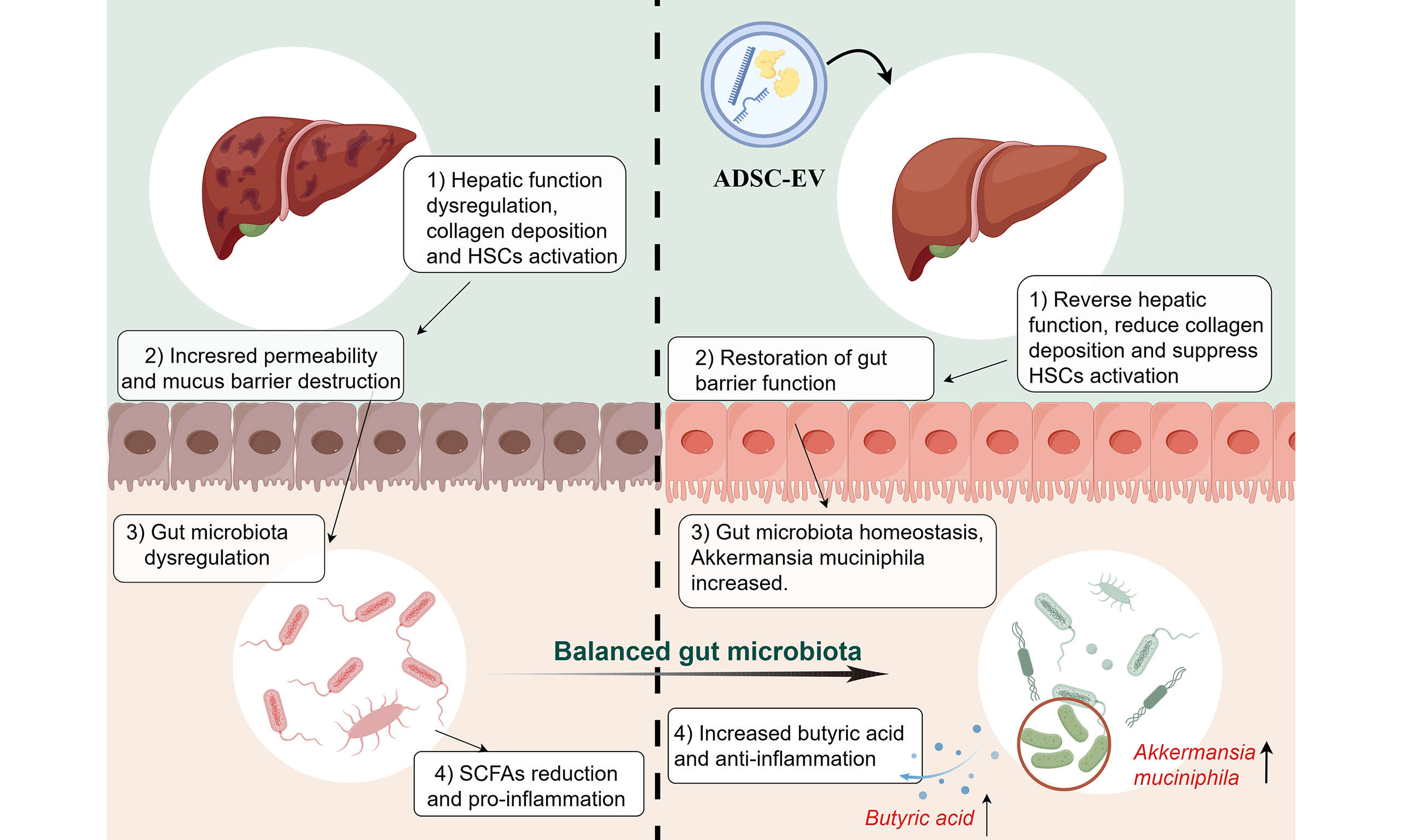 Results: ADSC-EVs effectively improved hepatic function, reduced collagen deposition and suppressed hepatic stellate cell activation, exhibiting potent anti-fibrotic potential in LF mice. Additionally, they significantly restored intestinal barrier integrity by reducing intestinal permeability and reinforcing the mucus barrier. Furthermore, ADSC-EV treatment regulated gut microbiota dysbiosis, increased the abundance of beneficial intestinal bacteria such as Akkermansia muciniphila. ADSC-EV intervention also elevated the level of butyric acid in cecal contents and significantly reduced systemic inflammation.