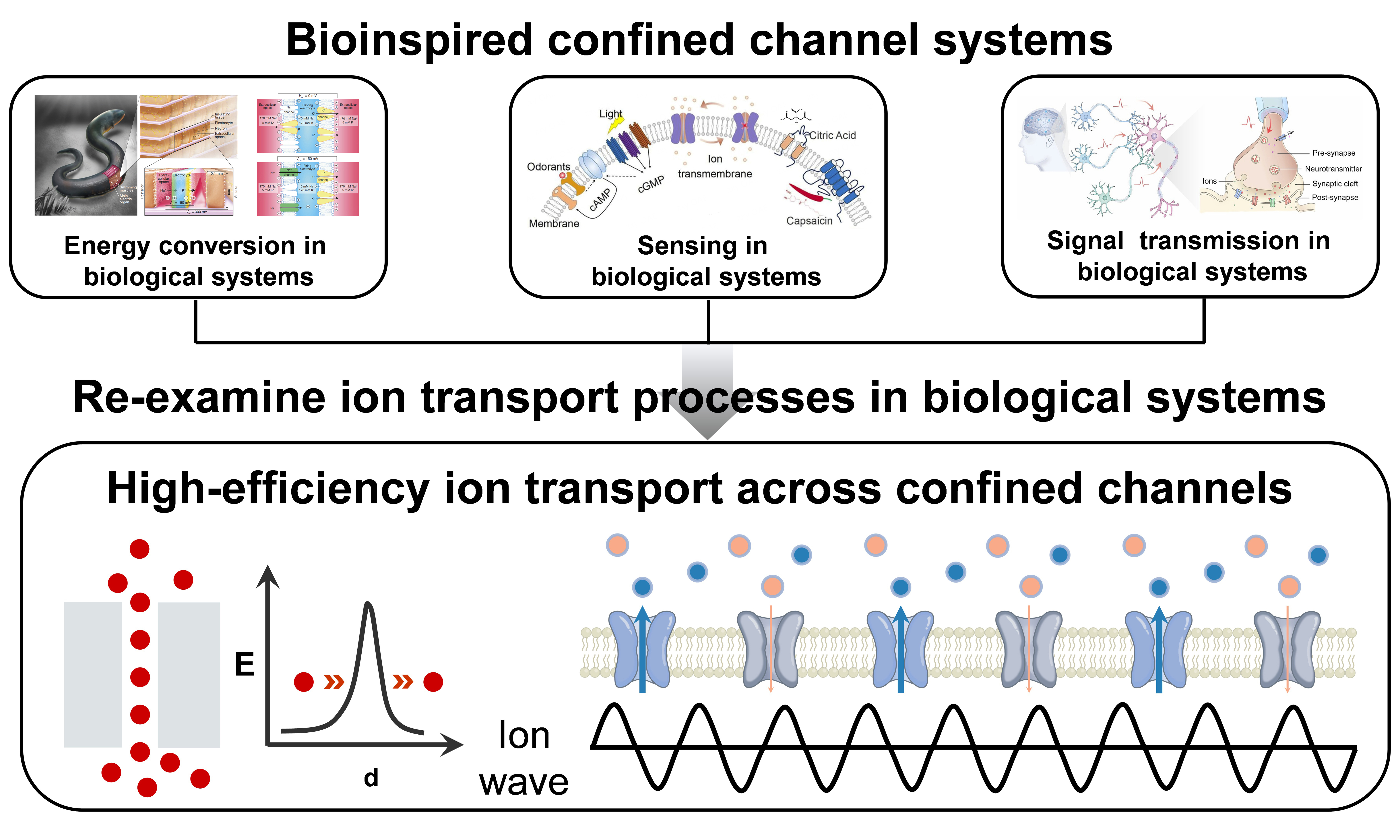 Although substantial progress has been made in fabricating bioinspired channel materials with different nanostructures, further enhancement of ion transport rates faces fundamental theoretical limitations. Current theoretical frameworks, primarily based on classical electrokinetic models and modified Nernst-Planck equations, fail to account for the ultrafast ion transport phenomena observed in biological systems[11]. This theoretical gap significantly hinders the rational design of next-generation artificial ion channels, whose performance remains far below that of biological systems. Consequently, the performance of bioinspired systems in energy conversion, sensing, and information processing is degraded. Therefore, we need to re-examine ion transport processes in biological systems and explore how ions traverse confined channels [Figure 1G]. Jiang et al. propose a macroscopic quantum state mechanism for ion transport[12]. Drawing from the theoretical framework, we can gain a clear understanding of how ions can achieve ultrafast transport in confined spaces. This framework suggests that under confined channels, ions could form a collective quantum fluid that enables near-dissipation-free transport. The establishment of such macroscopic quantum states provides a fundamental explanation for exceptional transport phenomena beyond classical predictions and offers new principles for designing advanced bioinspired channel systems with performance approaching biological levels.