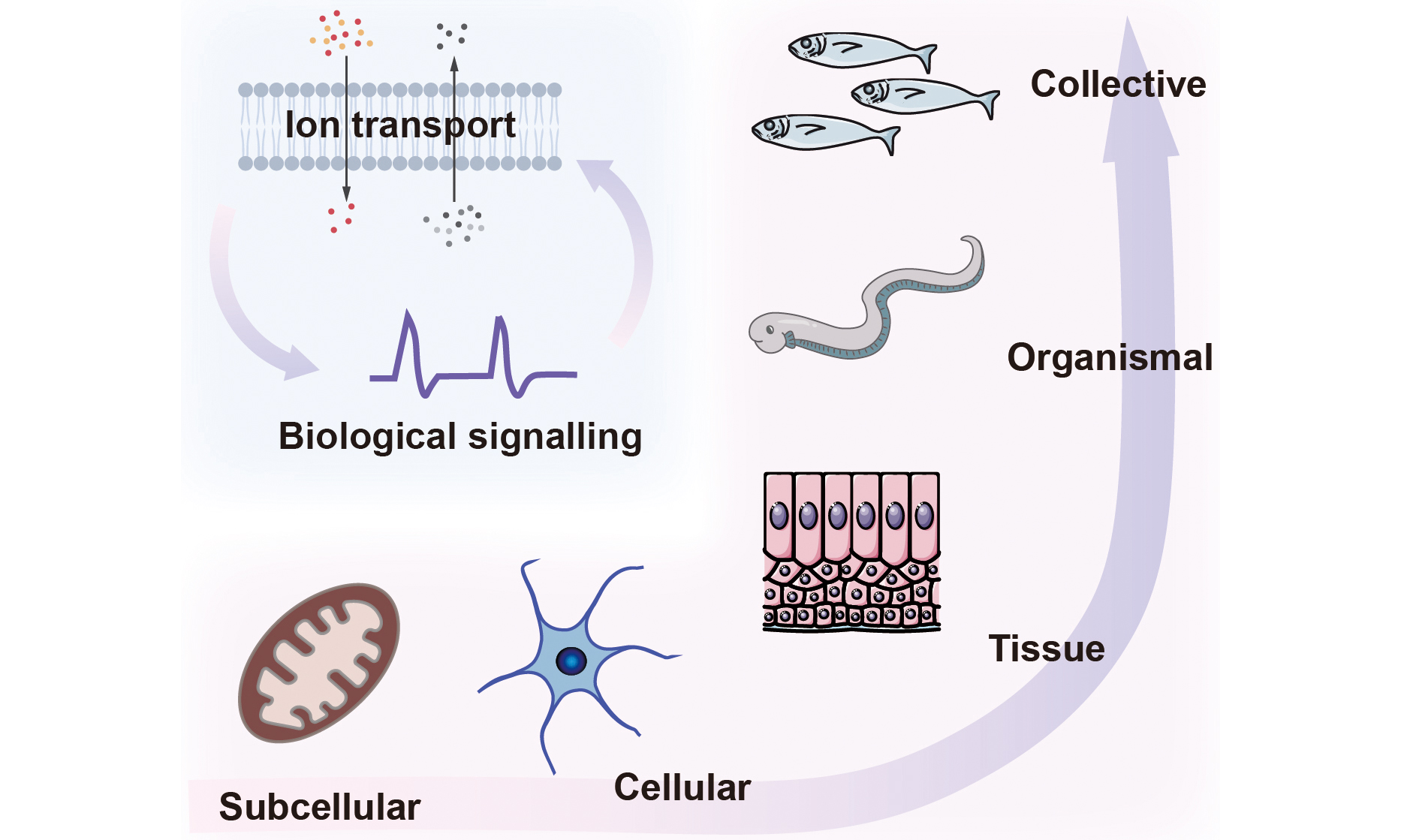 Figure 1. Biological ionic processes operate across scales, from the molecular scale to the collective scale.