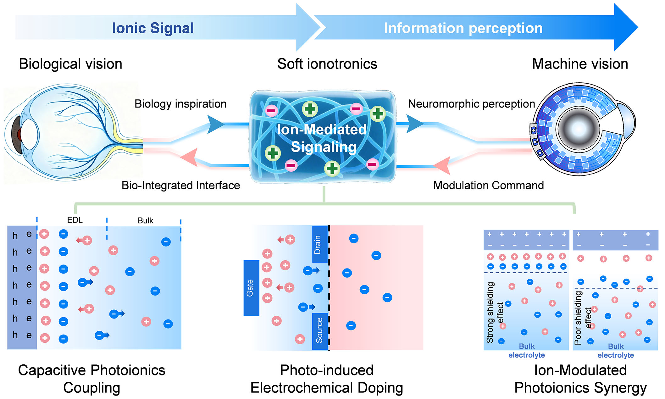 This review articulates a mechanism-driven framework for photo-iontronics, translating principles of biological vision into device design through three core coupling mechanisms: capacitive, photoelectrochemical doping, and ion-modulated synergy. These mechanisms underpin the development of next-generation retina-inspired perception chips and bio-integrated visual restoration interfaces. To advance from conceptual promise to practical application, critical bottlenecks in interface engineering, mechanism quantification, and system integration must be addressed. Future concerted efforts in material innovation and multi-scale regulation will be pivotal in harnessing ionic intelligence for transformative applications in low-power machine vision and adaptive neural repair. Ultimately, by shifting the paradigm from functional mimicry to mechanistic programming, we can unlock the full potential of iontronic devices for truly intelligent and adaptive visual systems.