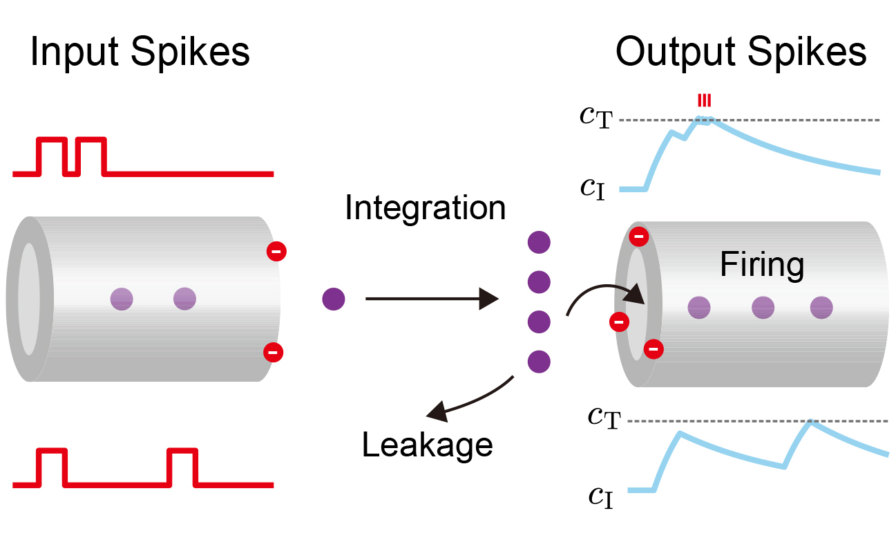 The neuron’s firing threshold, Vthres, is physically realized as a critical number of accumulated ions, cT, required to create a global control such as ion concentrations or chemical controls that significantly lowers the effective energy barrier for translocation into the CNT, ΔGF. This transforms the LIF model from a purely descriptive tool into a predictive engineering blueprint for designing artificial neurons with specific, tailored computational properties.
