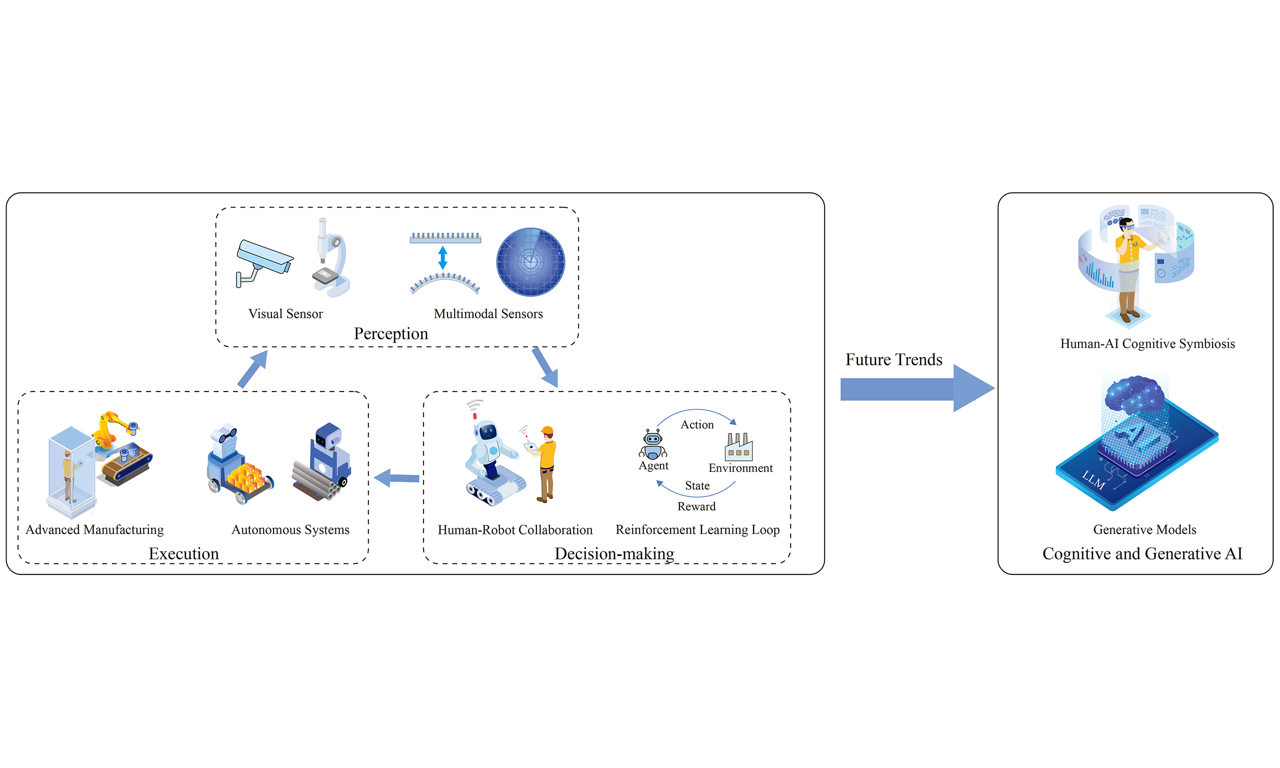 Driven by Industry 4.0, global manufacturing is undergoing a profound transformation. This shift is from mass production to mass customization and high-mix, low-volume (HMLV) production models[1-3]. Industrial robots, as the core of traditional automation, were initially designed to execute repetitive tasks with high precision. This was intended for highly structured and predictable environments[4]. However, this inherent rigidity, optimized for scaled production, fundamentally contradicts the needs of modern manufacturing. These needs include operational flexibility, environmental adaptability, and rapid task switching. Bridging this gap, by evolving industrial robots from static tools into intelligent partners, is a core challenge in smart manufacturing[5,6].