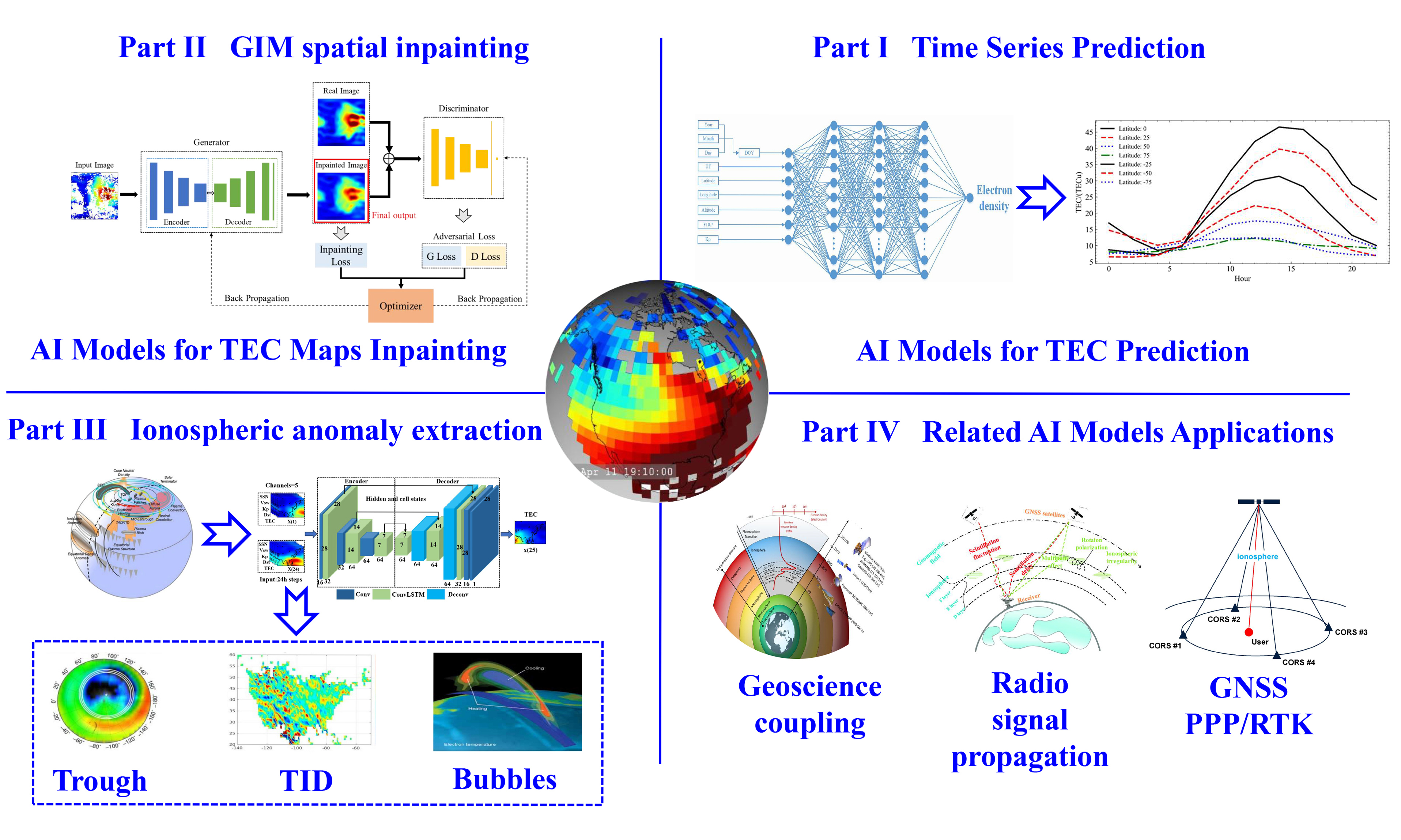 | Ionosphere spatial modeling | Data Augmentation Spatial TEC map completion | (Chen et al.[153]) (Ji et al.[152]) (Pan et al.[155]) (Chen et al.[156]) (Pan et al.[157]) (Yang et al.[180]) (Chen et al.[181]) | |