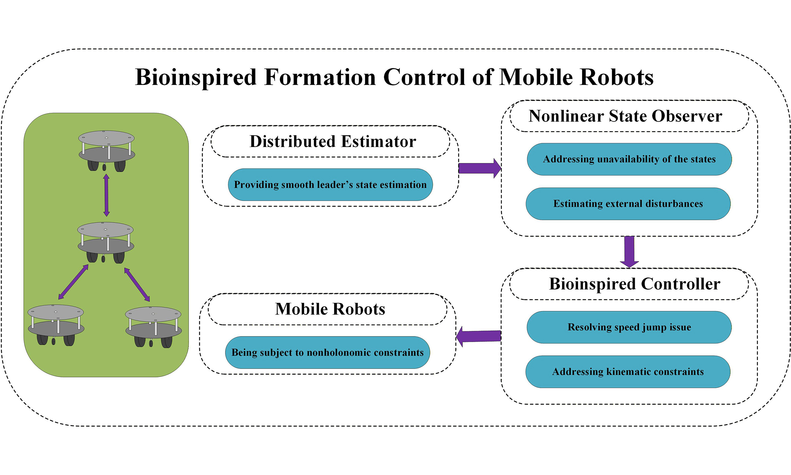 It is noticed that the robustness of the traditional centralized strategy decreases drastically when the number of following units increases, and failure of the leader node may trigger a system-level failure. Furthermore, the effectiveness of the system is strongly correlated with communication quality, and the surge of the network load is prone to lead to latency and deterioration of stability. To overcome these bottlenecks, modern research has increasingly adopted distributed control frameworks, which are developed based on local information exchange and awareness of neighboring states, thereby enhancing the system's fault tolerance and scalability [16,17]. There has been a significant amount of work that addresses the distributed formation approach of mobile robots [1822]. However, the formation performance heavily depends on the state estimation accuracy. In the work by Peng et al., an extended state observer along with a Kalman filter is developed to compensate for the disturbances and noises for mobile robots[23]. Another research proposed a fixed-time extended state observer that observes the total disturbances [24]. This research uses their respective approach to estimate the disturbances and the robot states. Furthermore, formation performance depends not only on the accuracy of the estimation techniques but also on the handling of practical constraints, such as velocity surge at the initial stage and velocity constraints, which occur in some of the existing work [25,26]. To better understand the velocity surge, it is described that when there is an initial error, the generated velocity is non-zero and therefore potentially generates an unreachable infinite torque command. Therefore, taking these critical challenges into the design of the formation control is rather important.
