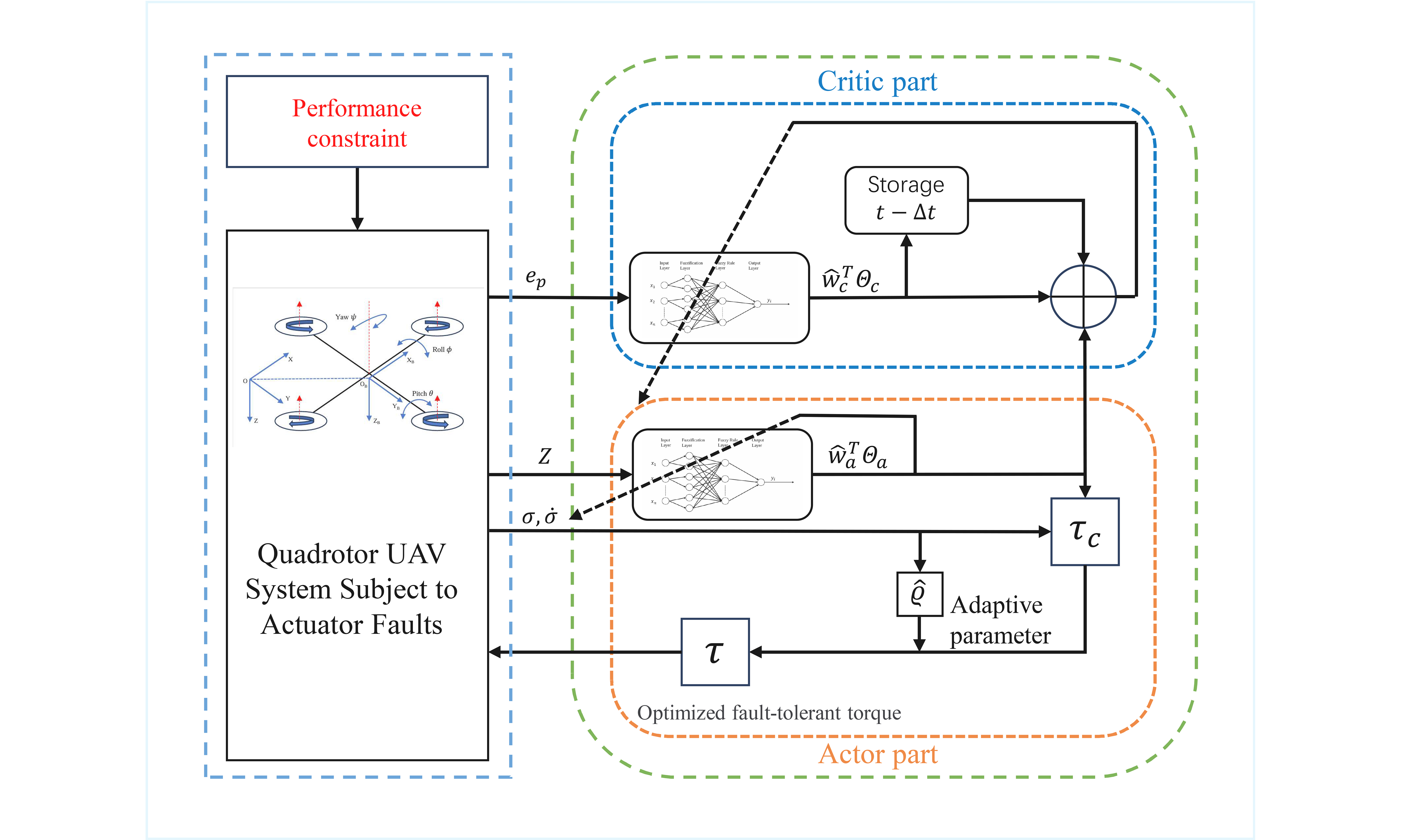 Theorem 1 For a quadrotor UAV system subject to performance constraints and actuator faults, the proposed RL-based fuzzy adaptive fault-tolerant attitude control strategy ensures stability and tracking performance. The error signals