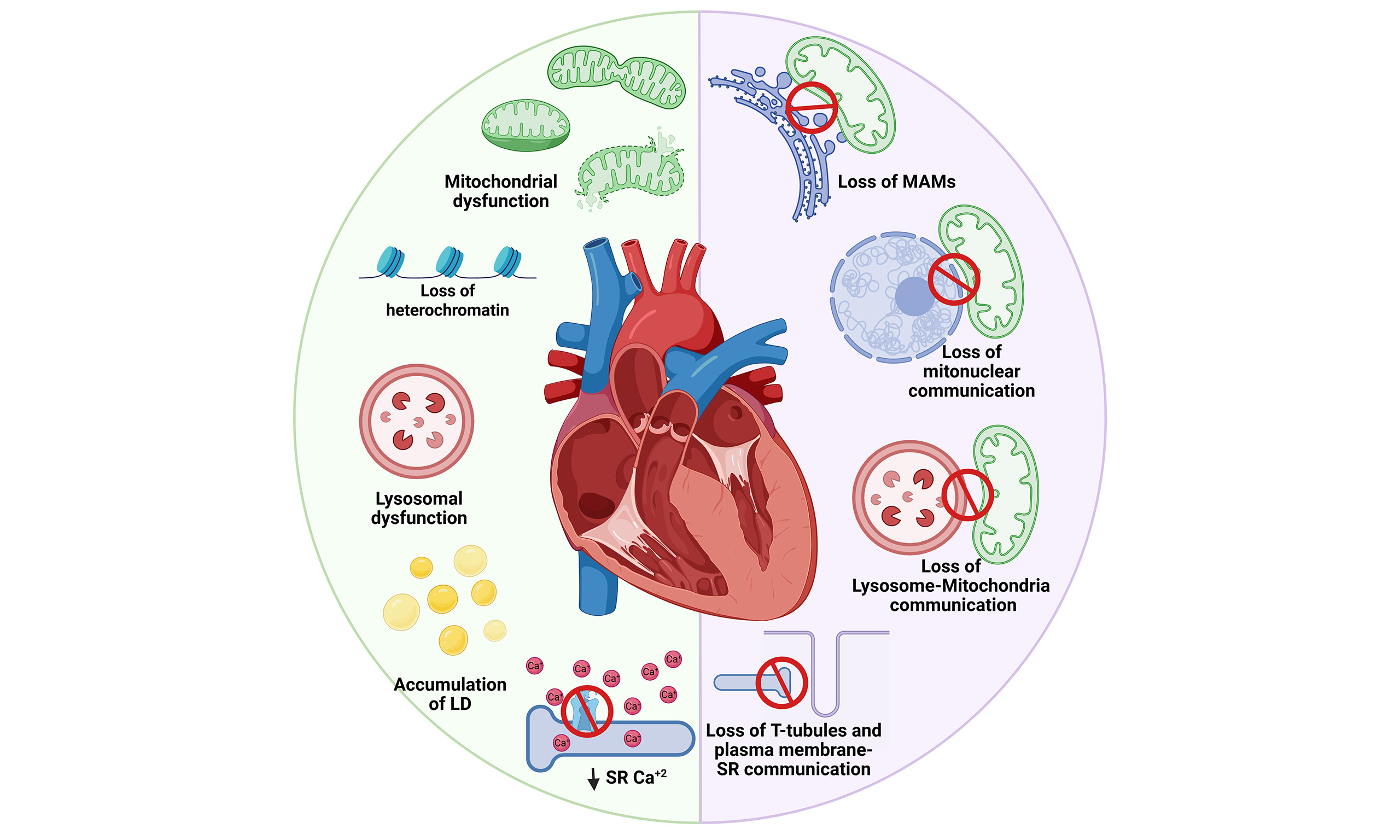 One of the emerging mechanisms linking these subcellular dysfunctions is the alteration of communication between organelles, a phenomenon that is particularly relevant in the context of aging. The interaction between mitochondria and ER, mediated by mitochondria-associated ER membranes (MAM), is affected by age, compromising the efficient transfer of calcium and lipids, as well as the regulation of apoptosis[25]. Likewise, impaired mitonuclear communication limits the ability to respond to mitochondrial damage, affecting the biogenesis and repair of these organelles[26]. These failures are amplified by processes such as inflammaging - chronic low-grade inflammation that drives the aging process - and cellular senescence, which promote a dysfunctional tissue microenvironment, with increased fibrosis, ventricular stiffness, and loss of contractility[27].