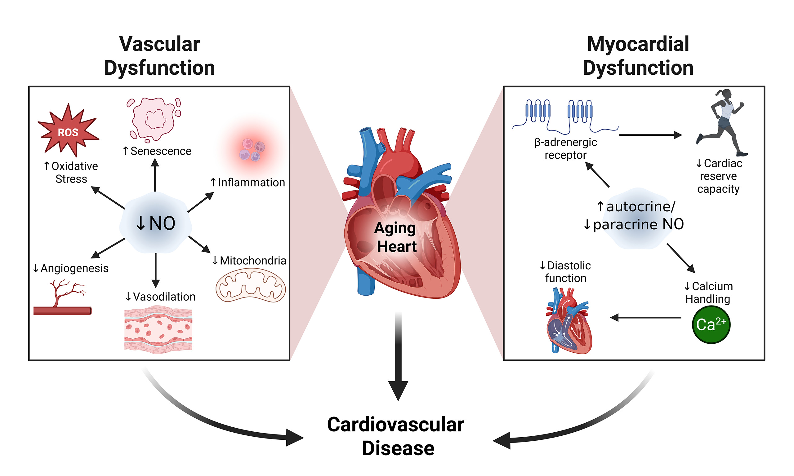 Nitric oxide (NO) signaling plays a pivotal role in regulating cardiovascular function, and its dysregulation is central to both vascular and myocardial aging. Initially recognized for its vasodilatory effects in the endothelium, NO is essential for maintaining vascular tone, and its age-related decline contributes to vascular dysfunction, characterized by impaired vasodilation, increased oxidative stress, and endothelial cell senescence. Beyond the endothelium, NO is now also known to influence a wide array of processes in cardiomyocytes, including excitation-contraction (EC) coupling[3-5], β-adrenergic responsiveness[6], mitochondrial function[7], and extracellular matrix remodeling[8]. However, its role in age-associated myocardial dysfunction remains less well understood. Studies over the past two decades have increasingly implicated dysregulated NO signaling - resulting from alterations in nitric oxide synthase (NOS) expression, cofactor availability, and oxidative stress - as a key mechanism underlying both vascular and myocardial dysfunction. However, our mechanistic understanding of how distinct NOS isoforms contribute to age-related alterations in NO bioavailability and signaling remains incomplete. As such, defining the precise role of NO in cardiovascular aging has become an area of active investigation, with growing recognition that restoring NO signaling may hold promise for mitigating age-related cardiac decline and improving outcomes in elderly patients with cardiovascular disease.