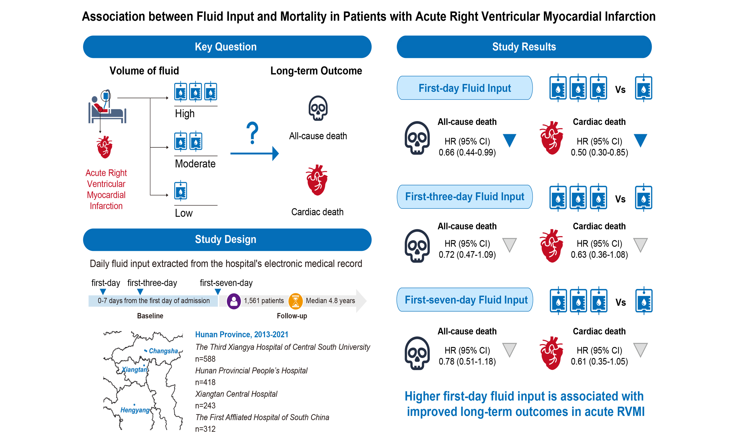 Methods: This retrospective multicenter study included 1,561 patients with RVMI from four hospitals between 1 January 2013 and 30 June 2021. Fluid input volume was assessed on the first day and as the average over 3 and 7 days. Cox proportional hazards models were used to evaluate associations with all-cause mortality, cardiac mortality, and in-hospital hypotension.