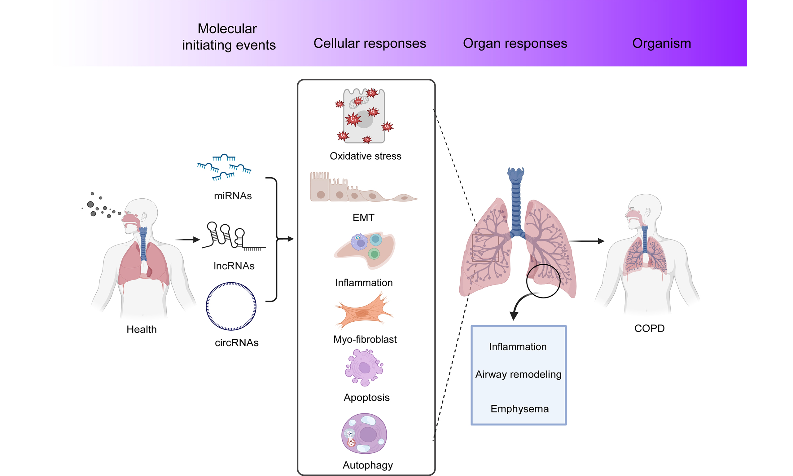 Fine particulate matter (PM2.5) remains a major air pollutant and has been identified as the second most significant risk factor for chronic obstructive pulmonary disease (COPD) prevalence in China[1-3]. Epidemiological evidence indicates that PM2.5 exposure is correlated with COPD morbidity[4], and even short-term exposure can increase hospitalizations and mortality related to the disease[5]. Despite progress in elucidating the underlying mechanisms, a comprehensive framework linking PM2.5 exposure to COPD pathology - including lung inflammation, emphysema, and small airway remodeling - remains incomplete. Key challenges include the complexity and diversity of molecular and cellular responses to PM2.5, which involve multiple pathways and targets, as well as the difficulty in integrating epidemiological, in vitro, and in vivo data to connect molecular initiation events with adverse outcomes (AOs). Additionally, the lack of integration between epidemiological, in vitro, and in vivo studies has made it difficult to establish a clear link between molecular initiation events and AOs. This integration is challenging due to: (i) the variability in homology of non-coding RNA (ncRNA) sequences across organisms (e.g., human, rodent, and nematode), making their expression levels difficult to verify at both the human and other model organism levels; (ii) the complexity of PM2.5 components across seasons and regions, which exerts varying effects on ncRNA profiles and leads to a wide array of molecular and cellular responses; (iii) the lack of standardization in ncRNA sequence platforms and analysis processes, making some results incomparable across studies.