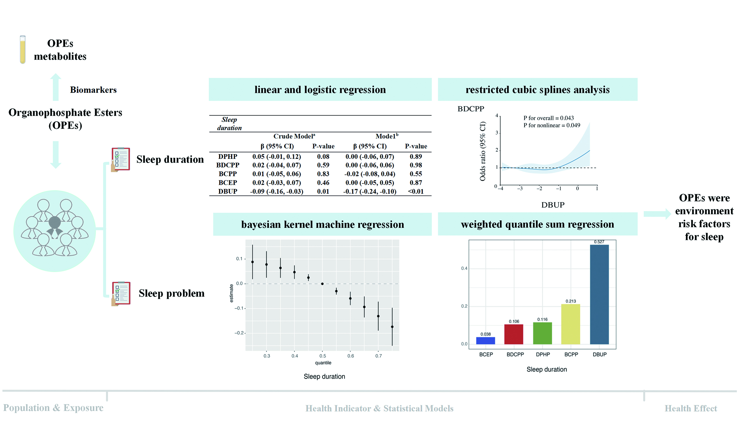 In summary, our findings suggest that urinary biomarkers of OPE exposure are statistically associated with sleep disturbances in the U.S. general population. Evidence from mixture analyses further indicates potential relationships between combined exposure to multiple OPEs and sleep health. Nevertheless, given the cross-sectional design of this study, these associations should not be interpreted as causal.