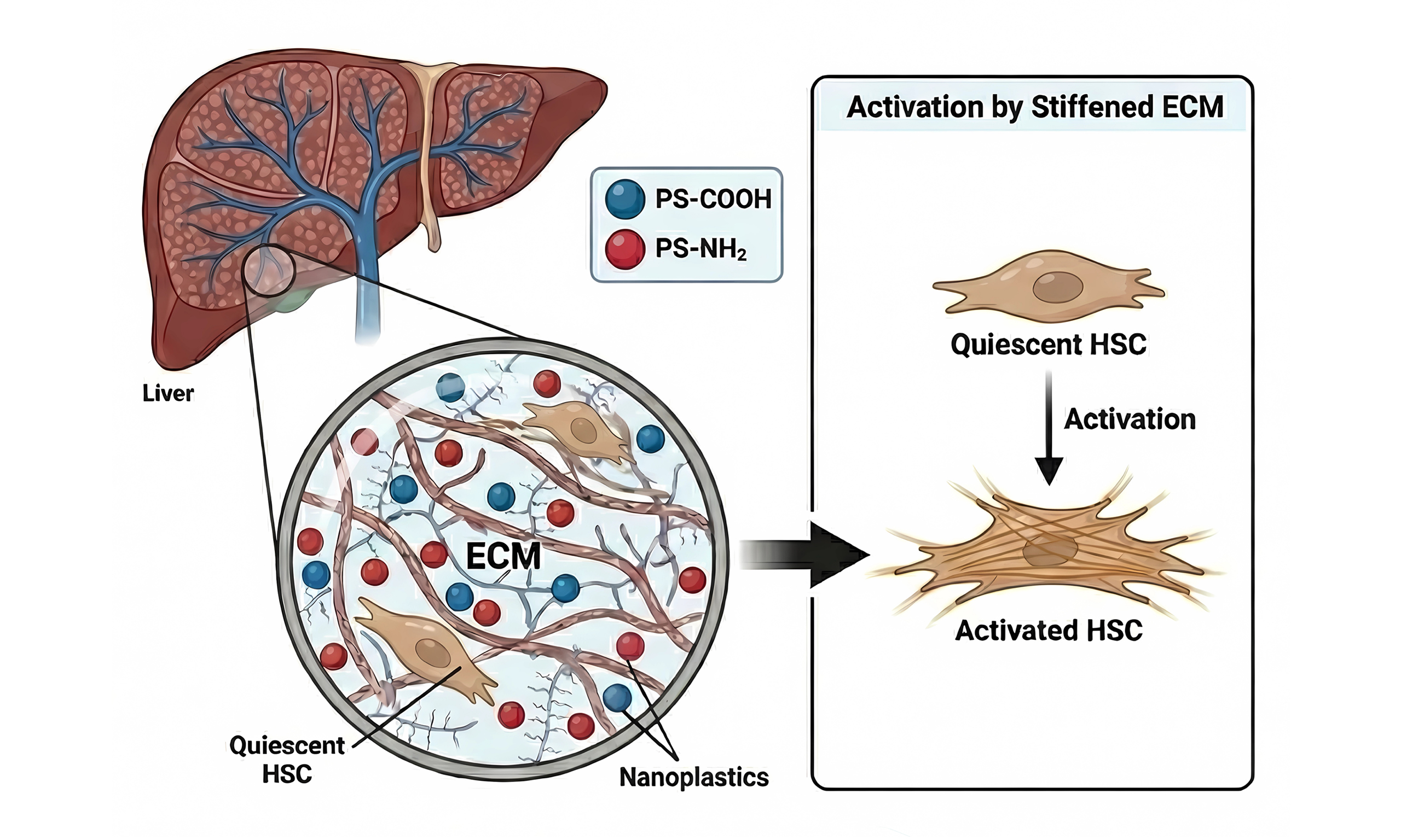 Nanoplastics may influence HSC activation indirectly by modulating ECM mechanical properties rather than solely through direct cellular uptake. This work bridges environmental toxicology and cellular mechanobiology, suggesting that assessments of nanoplastic health risks should also consider their potential to alter the tissue mechanical microenvironment.