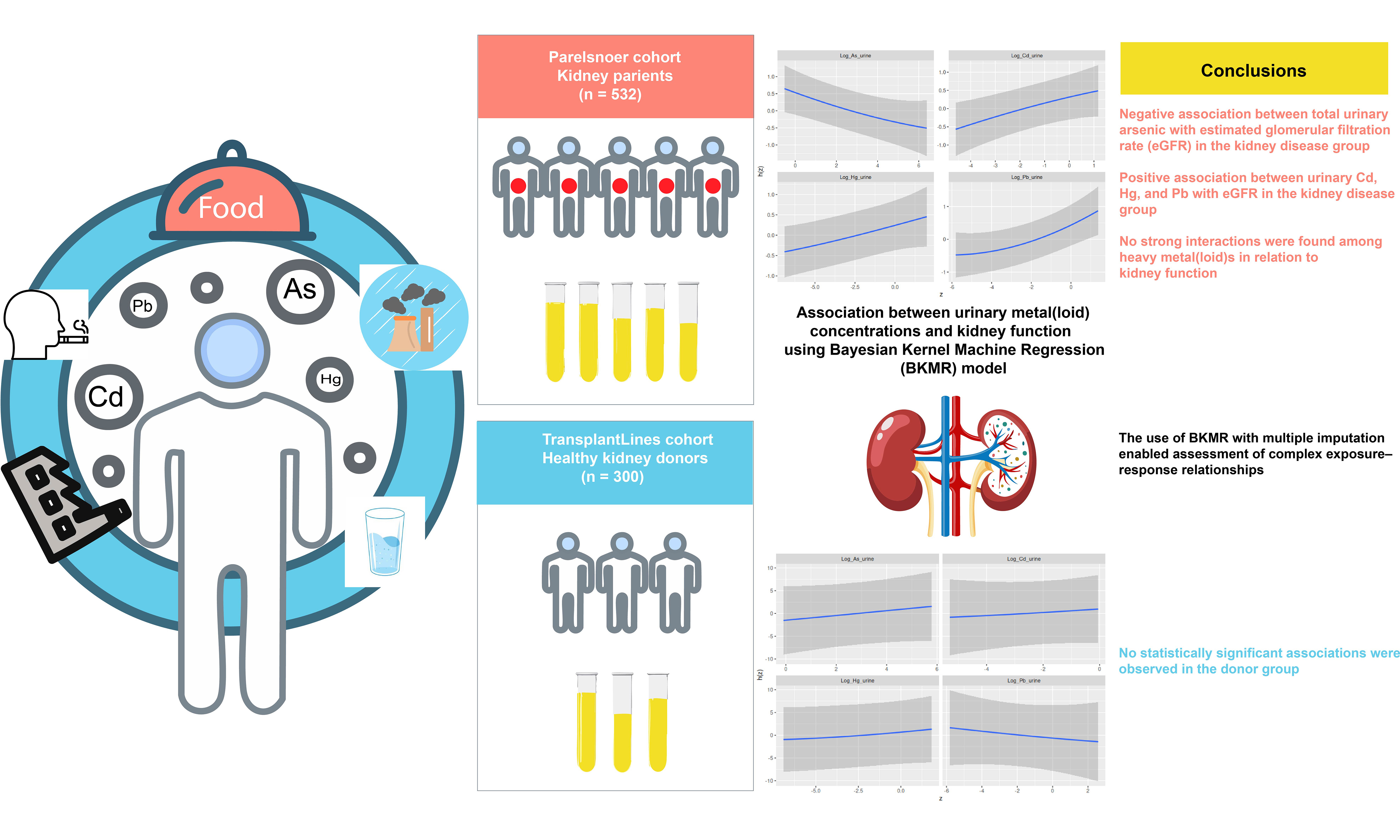 The aims of the present study are: (1) to measure urinary concentrations of heavy metal(loid)s in kidney patients and healthy individuals; and (2) to examine the association between urinary heavy metal(loid) concentrations and renal function within each group. To assess potential nonlinear exposure-response relationships and interactions among co-exposures, BKMR was applied to both groups.
