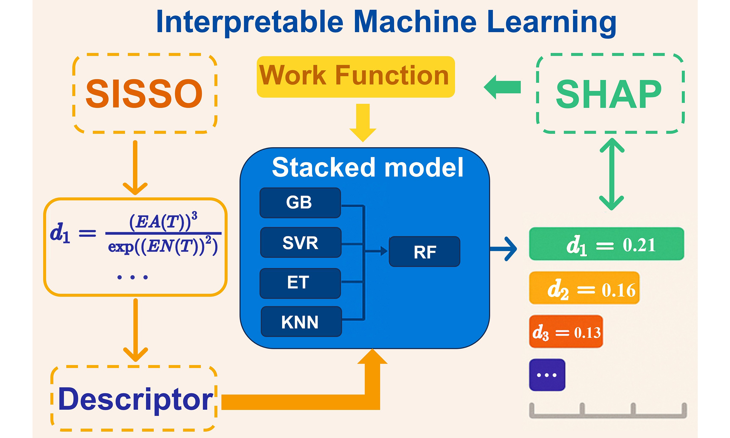 As illustrated in Figure 1, the workflow begins with rigorous data selection and cleaning for model training and validation. Herein, the raw data of the work function of MXenes were curated from the recently created C2DB. Then, the SISSO algorithm was utilized to construct the descriptors with enriched physics insights between features and target properties, which will effectively improve the accuracy and interpretability of ML. Meanwhile, a stacked model that combines predictions from various base models into a refined meta-model was constructed, which was confirmed to possess not only enhanced generalization but also effectively reduced errors, overfitting, and biases. Additionally, SHAP was leveraged to determine feature importance, providing nuanced insights into the role of atomic-layer compositions and feature interdependencies in governing work function behavior. Ultimately, ML, combined with material science knowledge, provides a deeper understanding of the factors influencing the work function of MXenes.
