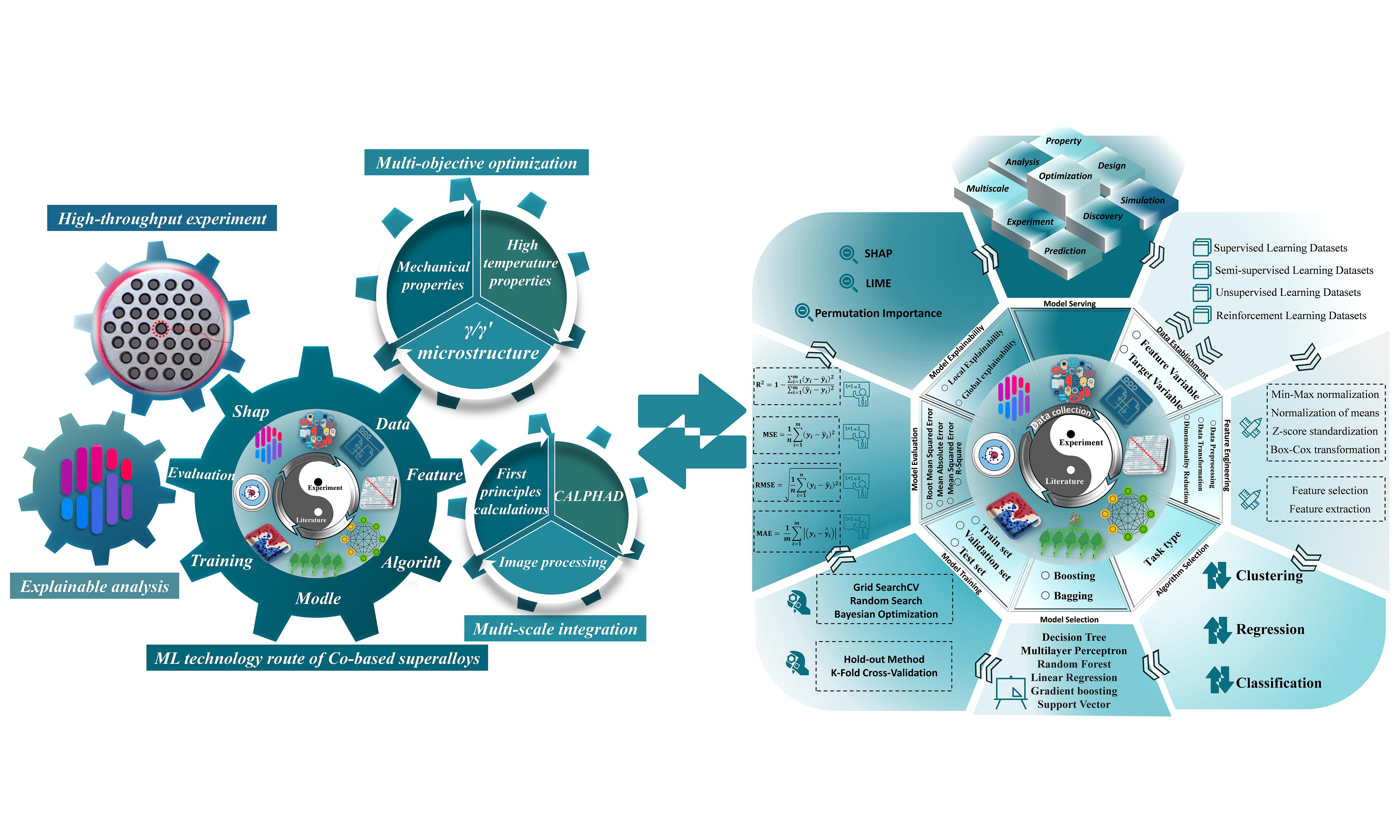 With the rapid development of modern computer science and artificial intelligence fields, the design and application of machine learning (ML) algorithms continue to break through the traditional boundaries based on the significant improvement of algorithmic capabilities brought about by the deep integration and cross-innovation of various disciplines, such as computer science, statistics, and mathematics. With the deep intersection of materials science and artificial intelligence, the proposal and implementation of the concept of genetic engineering of materials has had a profound impact on the field of materials science, promoting the new development of data-driven materials research and development (R&D), in which artificial intelligence technology represented by ML algorithms has gradually entered into the R&D and application of advanced materials vision[7,8]. As mentioned earlier, in practical applications, multi-component superalloys are usually more likely to obtain excellent overall properties, such as high-temperature strength, oxidation resistance, creep resistance, corrosion resistance, and wear resistance. However, traditional materials science research is only based on the first paradigm of experimental science and the second paradigm of theoretical science[9-11], which is often inefficient and costly to optimize the alloy properties by repeated trial and error through experience and experiments. As the third paradigm of scientific research (computational science), ML methods have great advantages in analyzing and processing complex data compared with traditional research methods, which can deeply excavate the implicit laws between material knowledge and properties, and achieve fast and accurate prediction or analysis of unknown material properties and mechanisms, thus efficiently guiding material design, performance optimization, process optimization and mechanism investigation[12-16]. With the cross-development of ML in alloys in the last decade, the results of ML applications, whether in the fields of iron and steel materials[17], titanium alloys[18], shape memory alloys[19-21] or superalloys[22-25], have demonstrated the feasibility of the method and are quite mature.