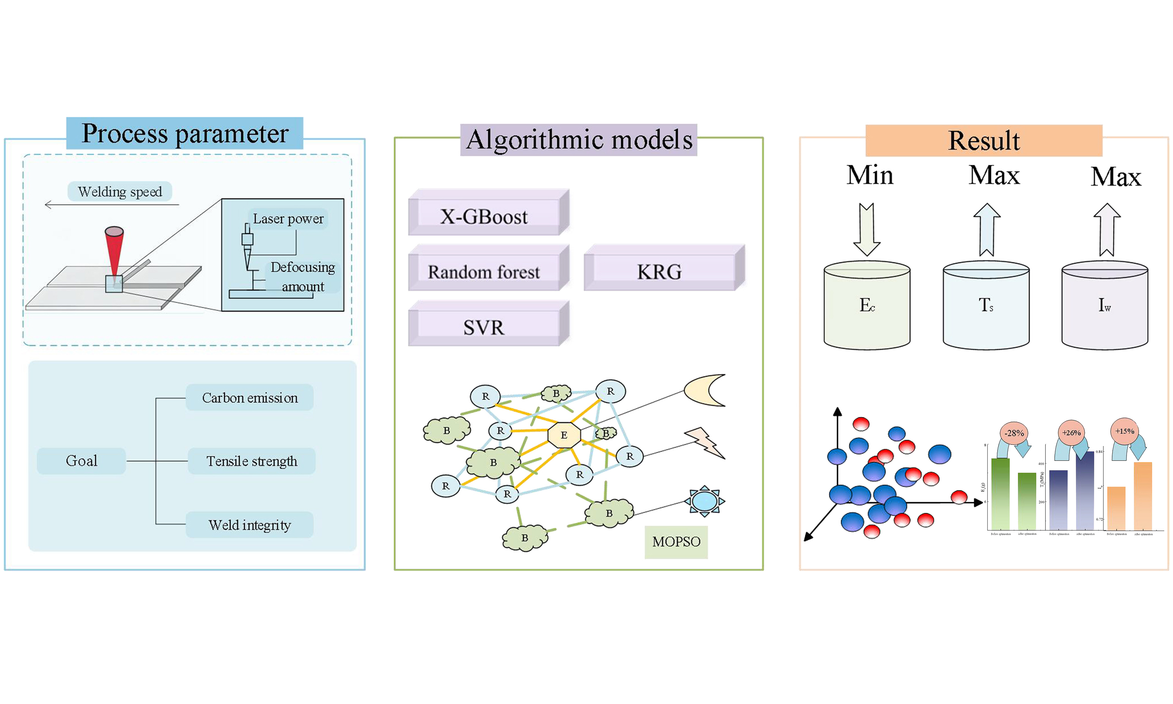 In parallel, multi-objective optimization (MOO) approaches have been increasingly applied to welding processes to address inherent trade-offs among penetration depth, tensile strength (TS), bead geometry, energy consumption, and emissions. Jiang et al. combined finite element modeling, Kriging (KRG) surrogate models, and the second-generation non-dominated sorting genetic algorithm (NSGA-II) to optimize 316L welding parameters, showing improved weld geometry and efficiency[8]. Yang et al. used an ensemble of metamodels with NSGA-II to optimize hot-wire laser welding, balancing weld depth-to-width ratio (IW), reinforcement height, and strength[9]. These studies demonstrate the feasibility of MOO methods but also reveal that sustainability-oriented metrics - such as carbon emissions (EC) - are seldom explicitly integrated with mechanical performance in welding optimization.