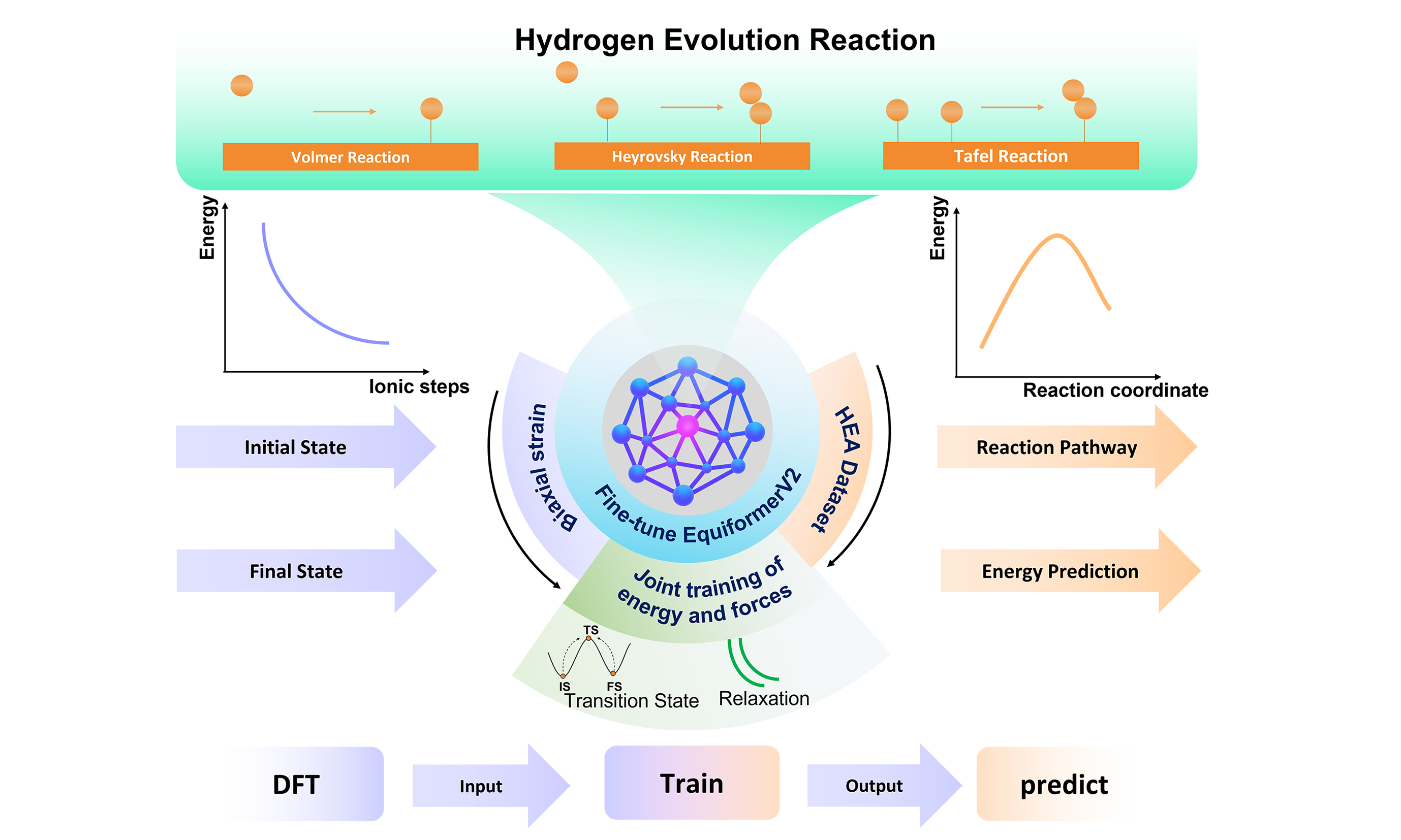 To address these fundamental challenges, we introduce a fine-tuned EquiformerV2[22] (eqV2) framework specifically designed for HER pathway prediction in strain-engineered HEAs. Figure 1 illustrates our comprehensive approach to modeling Volmer, Heyrovsky, and Tafel pathways across the compositionally complex Ir-Pt-Rh-Pd-Ru system under systematic biaxial strain conditions. By leveraging transfer learning from the OC20 dataset within the CatTSunami framework [a framework that transfers OC20-pretrained GNNs to NEB tasks and uses the OC20 Nudged Elastic Band (OC20NEB) dataset][11], our model converts computationally prohibitive TS searches into rapid, second-scale predictions while maintaining high accuracy.
