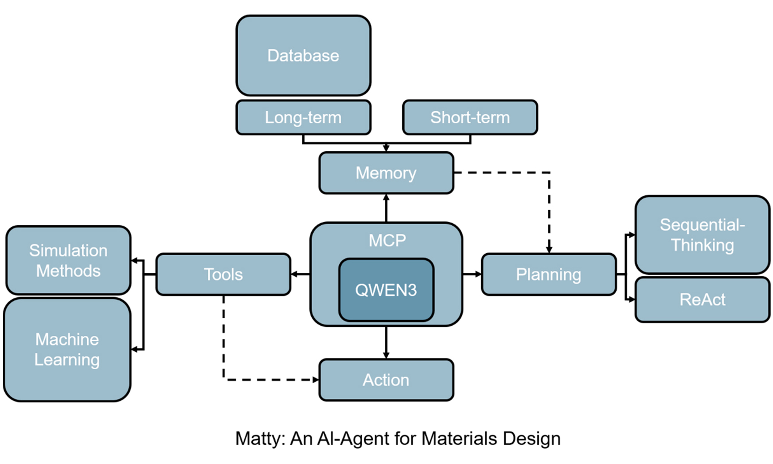 To support intelligent and adaptive materials design, we developed an AI-Agent system, Material Buddy (Matty), capable of autonomously constructing and executing complex simulation workflows. As illustrated in Figure 1, Matty is built upon LLM-driven architecture that tightly couples sequential reasoning with ReAct. At the core of the system is the Qwen3-235B-A22B-FP8[41] LLM, which serves as the cognitive engine for natural language understanding, task decomposition, and strategic planning. Matty also adopts the MCP, a standardized interface that facilitates seamless integration of diverse computational tools. Leveraging the MCP service, Matty can dynamically plan, invoke, and execute tasks in a stepwise fashion by autonomously translating high-level material design objectives into actionable workflows. Built on this LLM + MCP framework, Matty integrates a comprehensive suite of software tools spanning structure perception, data-driven memory, decision-making, simulation, and ML. These tools are organized into five functional modules - perception, memory, decision & planning, execution, and learning & optimization - forming a flexible and extensible platform capable of handling a wide range of design tasks across molecular and crystalline materials domains.