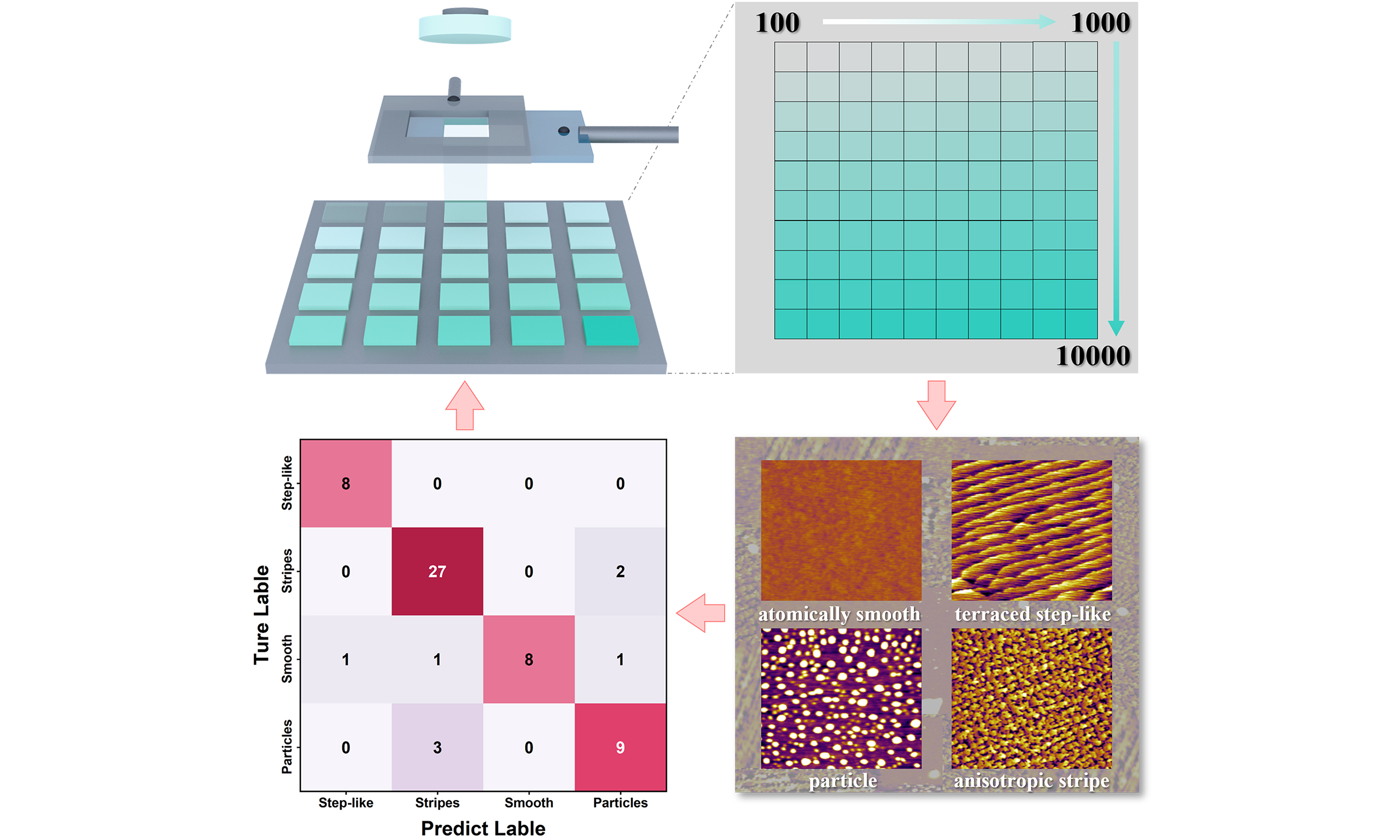 Functional oxide films have emerged as a critical class of materials in advanced technology sectors due to their highly tunable physical properties, compatibility with conventional semiconductor processes, and distinctive interface-mediated phenomena[1-5]. These characteristics collectively facilitate enhanced and frequently novel nanoscale functionalities, such as ferroelectric switching[6-10], piezoelectric responses[11,12], multiferroic behavior[13,14], and cross-coupling effects[15], thereby establishing functional oxide films as indispensable components across modern microelectronics, optoelectronics, energy conversion systems, and information storage technologies[16]. The quality and performance orientation of films can be comprehensively evaluated through a suite of optical and electrical characterization techniques such as atomic force microscopy (AFM)[17], X-ray diffraction (XRD)[18], and reciprocal space mapping (RSM)[19]. Among these, film morphology represents one of the most fundamental and intuitive types of data, critically influencing crystallographic quality and functional stability[20]. Thus, establishing dynamic relationships among processing conditions, morphology, and functional properties is essential for rapidly guiding experiments and screening desired performance. However, current research still relies heavily on iterative trial-and-error methods based on individually fabricated samples[21]. This approach is not only time-consuming and labor-intensive but also prone to experimental variability, particularly for complex functional oxides highly sensitive to processing parameters[21]. Moreover, optimization derived from limited sample sizes and compositional ranges may lead to missed opportunities for discovering novel physical phenomena or achieving optimal functional properties at specific components[22].
