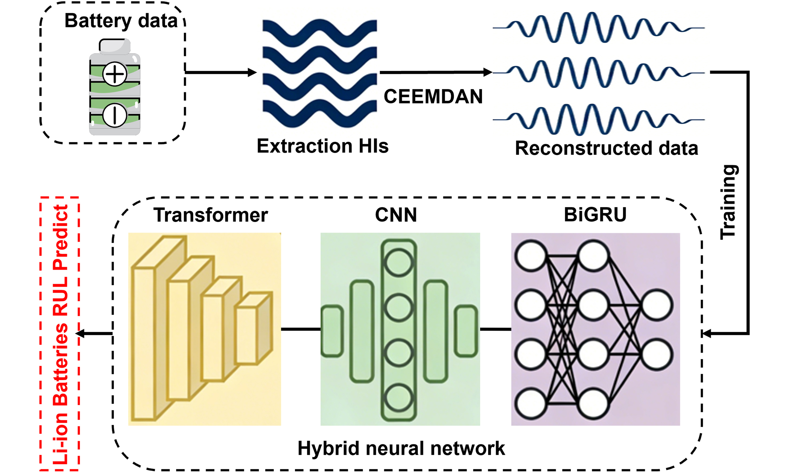 Lithium-ion battery, deep learning model, RUL prediction, CEEMDAN denoising, BiGRU, Transformer
