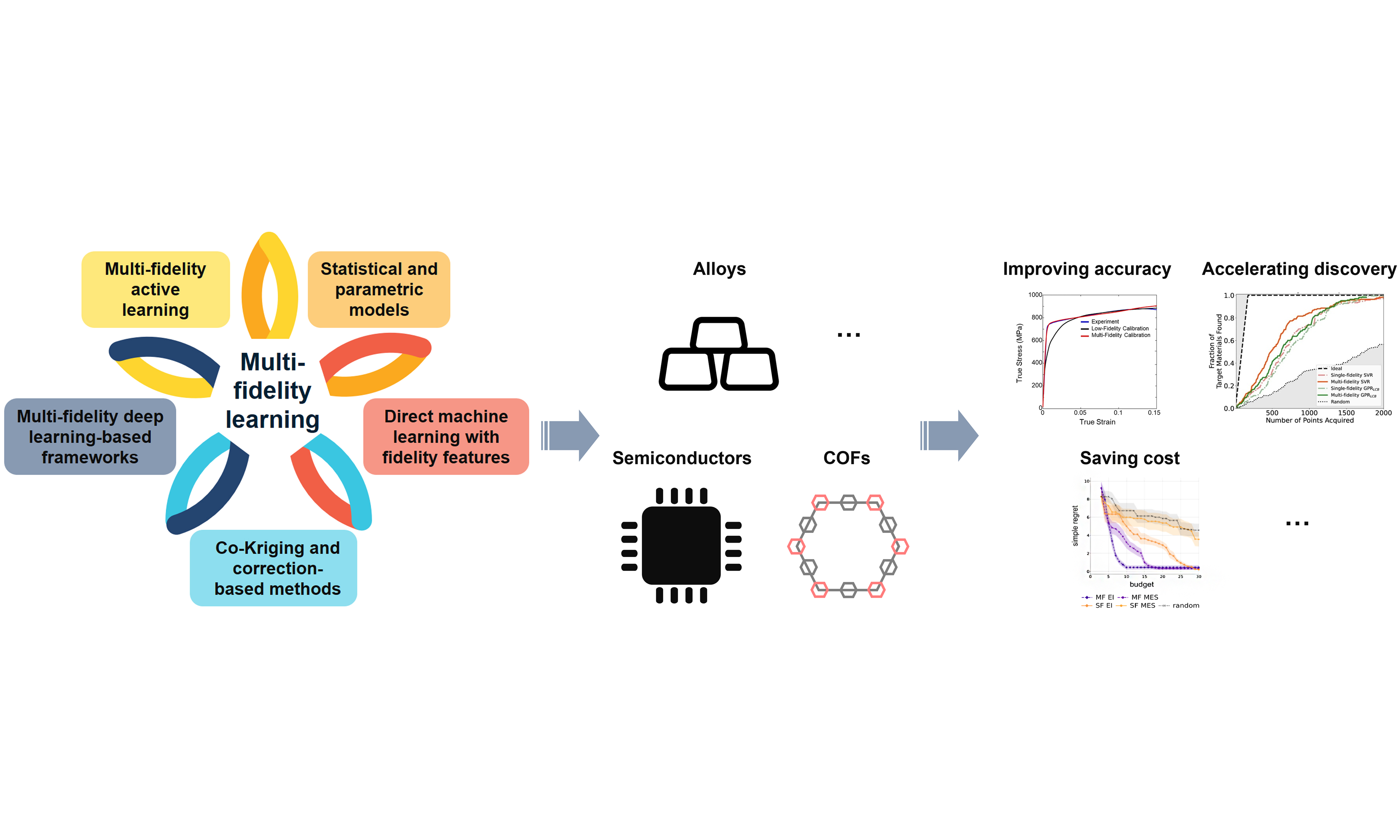 MF learning has broad practical relevance across materials research, spanning high-throughput screening pipelines[42,54], interatomic potential predictions[38-40], and data-driven design of new materials[37,55]. In steel design, it couples fast thermo-micromechanical surrogates with strategically chosen HF finite element evaluations to optimize strain-hardening performance with both efficiency and accuracy[53]. In halide perovskites, MF machine learning integrates semi-local and hybrid-functional DFT data with experimental measurements to predict decomposition energies, guiding the genetic algorithm-driven discovery of stable photovoltaic alloys[56]. In polymers, a MF co-training neural network fuses all-atom molecular dynamics simulation data (LF) with scarce experimental measurements (HF) to accurately predict phthalonitrile melting points, enabling low-cost screening of low-melting candidates for improved processability[57]. In geomaterials, an active-learning MF residual Gaussian process (GP) framework was trained on abundant LF data collected across multiple sites, with predictive uncertainty used as an acquisition function to guide HF sampling. This approach demonstrated robust extrapolation in sparsely sampled regions and significantly reduced HF data requirements compared to single-fidelity (SF) models[58]. In additively manufactured alloys, MF physics-informed frameworks have been developed that combine physics-guided LF data generation with transfer learning on limited HF measurements, achieving improved accuracy and physical consistency in fatigue life prediction[59]. More broadly, as labs juggle mixed-cost measurements and computational proxies, best-practice guidelines for MF Bayesian optimization codify when and how to couple LF and HF sources to maximize discovery per unit budget and avoid failure modes in practical materials discovery campaigns[60].