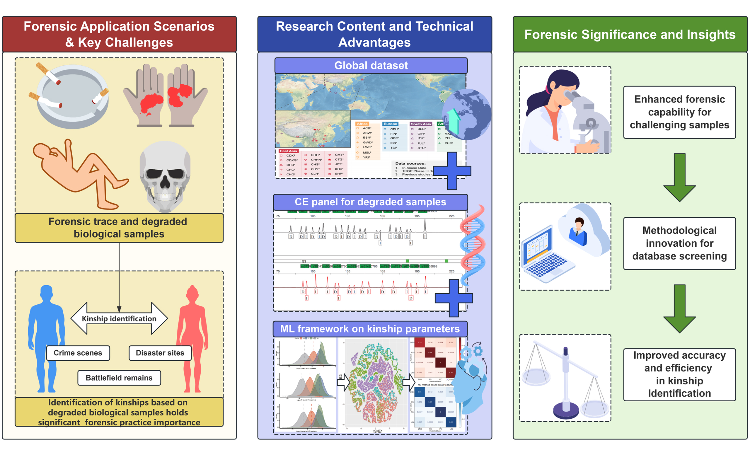 Forensic kinship analysis is vital and challenging for disaster victim identification and cold case investigation, particularly when dealing with highly degraded biomaterials. However, despite the strong polymorphism and widespread adoption of the short tandem repeat capillary electrophoresis as the standard approach for kinship analysis, its effectiveness is limited by longer amplicon lengths. Highly degraded biomaterials encountered at forensic scenes may result in incomplete or unreliable genotyping and artifacts. Characterized by its short amplicon, low mutation rate, and absence of stutter peaks, Insertion/Deletion polymorphism (InDel) has garnered increasing attention from forensic researchers[1-3]. Featuring smaller amplicons (< 230 bp) of the selected 57 autosomal InDel loci, the AGCU-60 InDel loci has well validated its efficacy for paternity testing in a series of studies based on numerous populations[4-9], where a complete variant call could be obtained from samples with a minimum DNA input of 125 pg. However, InDel loci, as exemplified by this panel, face challenges in kinship analysis. When analyzing highly degraded samples, prior knowledge about the genetic background of the unknown donor is often unavailable. Consequently, the only feasible approach is to conduct large-scale database matching to identify potential relatives.