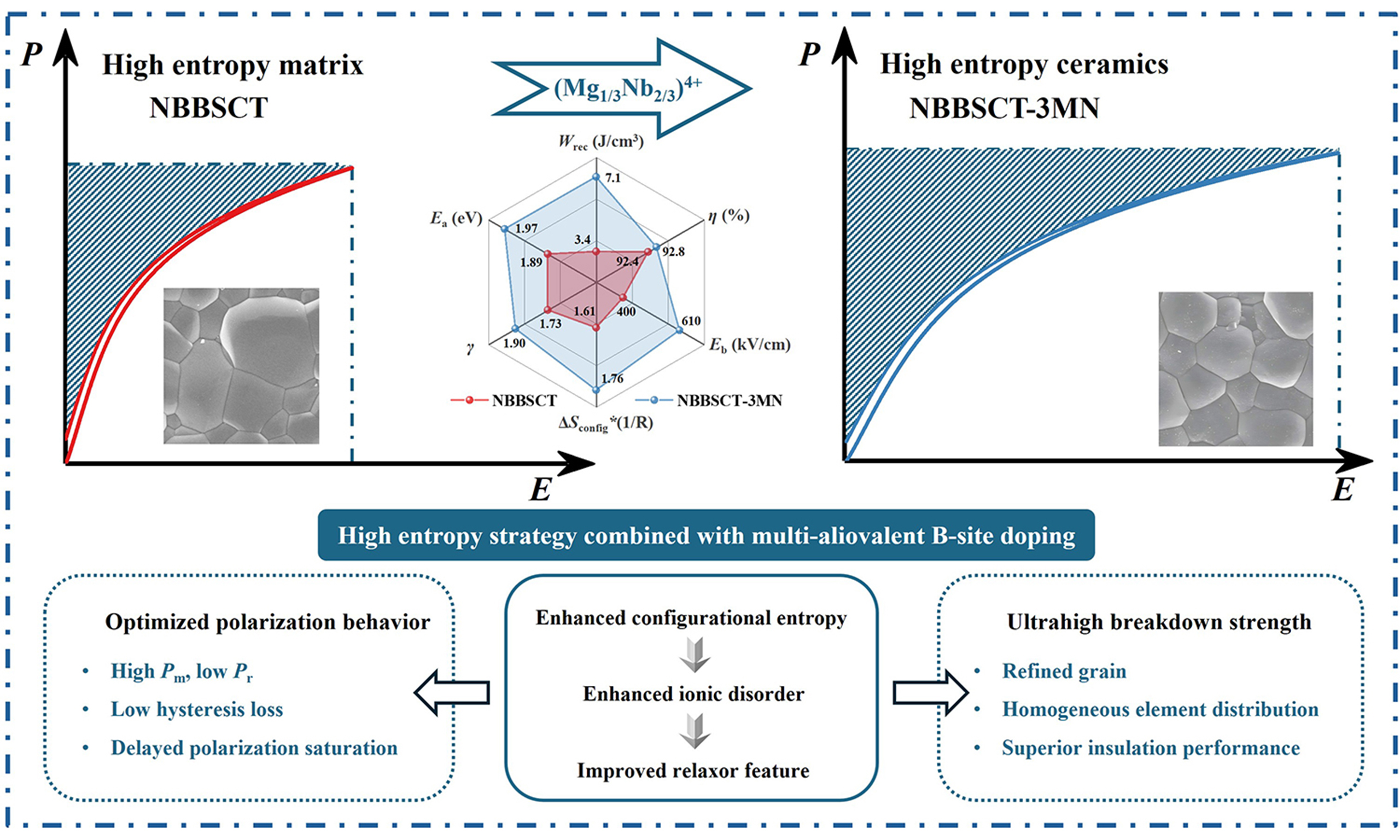 Based on the above considerations, aliovalent combination ions (Mg1/3Nb2/3)4+ (MN) were selected to substitute the B site of the high-entropy matrix NBBSCT in this work. The newly designed HECs,