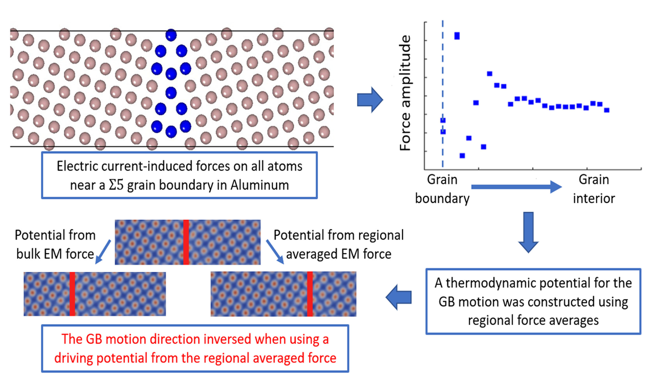 In summary, this work carried out the first calculation of EM forces for atoms near a GB. A striking feature of the EM force near the symmetrical Σ5 tilt GB in Al is identified for the first time which leads to a motion of GB atoms in opposite direction from the bulk atoms under the electric current. An effective potential which reproduces the averaged EM force near the GB is constructed. GB motion consistent with the force calculations is demonstrated using a PFC based microstructure evolution model incorporated with an effective potential. Although the EM force calculation is performed for a single GB only, it brings up the necessity to carefully consider the current-induced forces at quantum mechanical level in modelling microstructure evolutions.