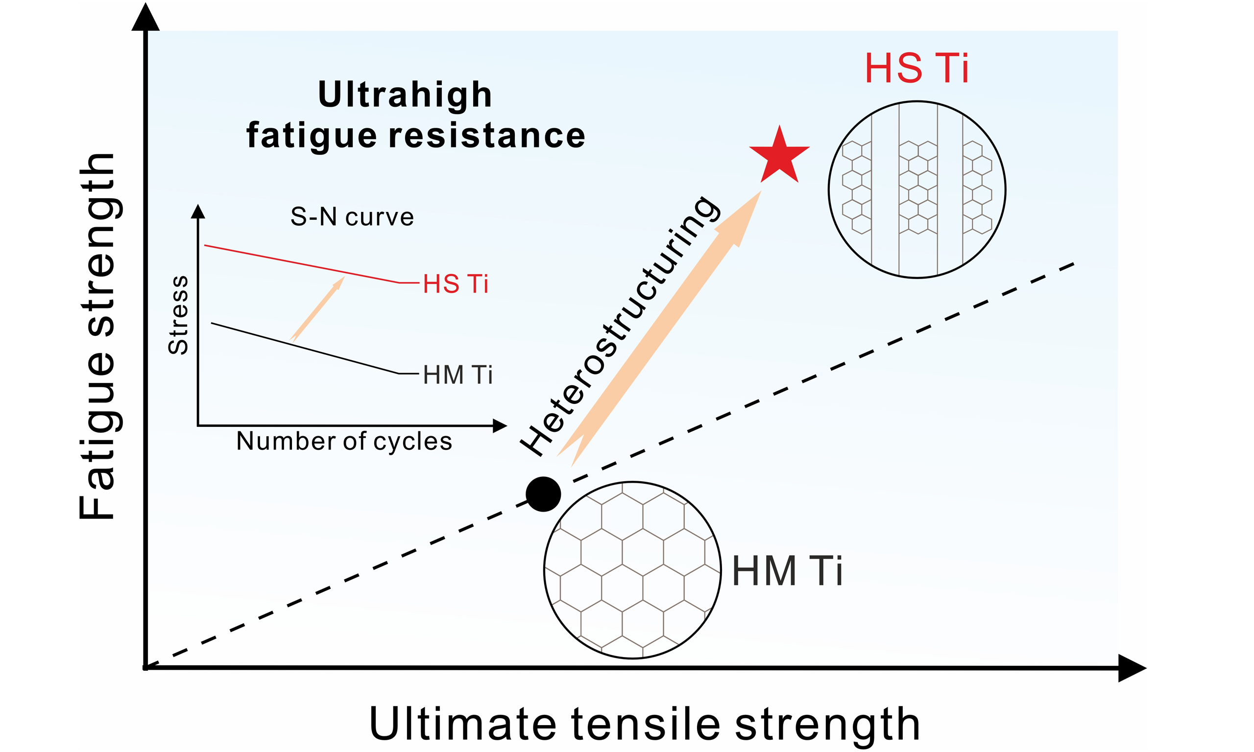 In summary, this study presents a systematic investigation into the impact of heterostructures on fatigue behavior. The heterogeneous structure in HS Ti comprises a mixture of coarse and fine grains, in contrast to HM Ti, which consists of equiaxed grains of uniform size. Under stress-controlled cyclic loading, HS Ti exhibits an exceptional fatigue strength of approximately 414 MPa, resulting in a fatigue ratio of 0.72, outperforming its HM Ti counterparts. The heterostructure facilitates the formation of a high density of GNDs during cyclic loading, leading to HDI strengthening and superior microstructural stability, which further contribute to high fatigue resistance. This study underscores a potential strategy for designing fatigue-resistant metals and alloys.