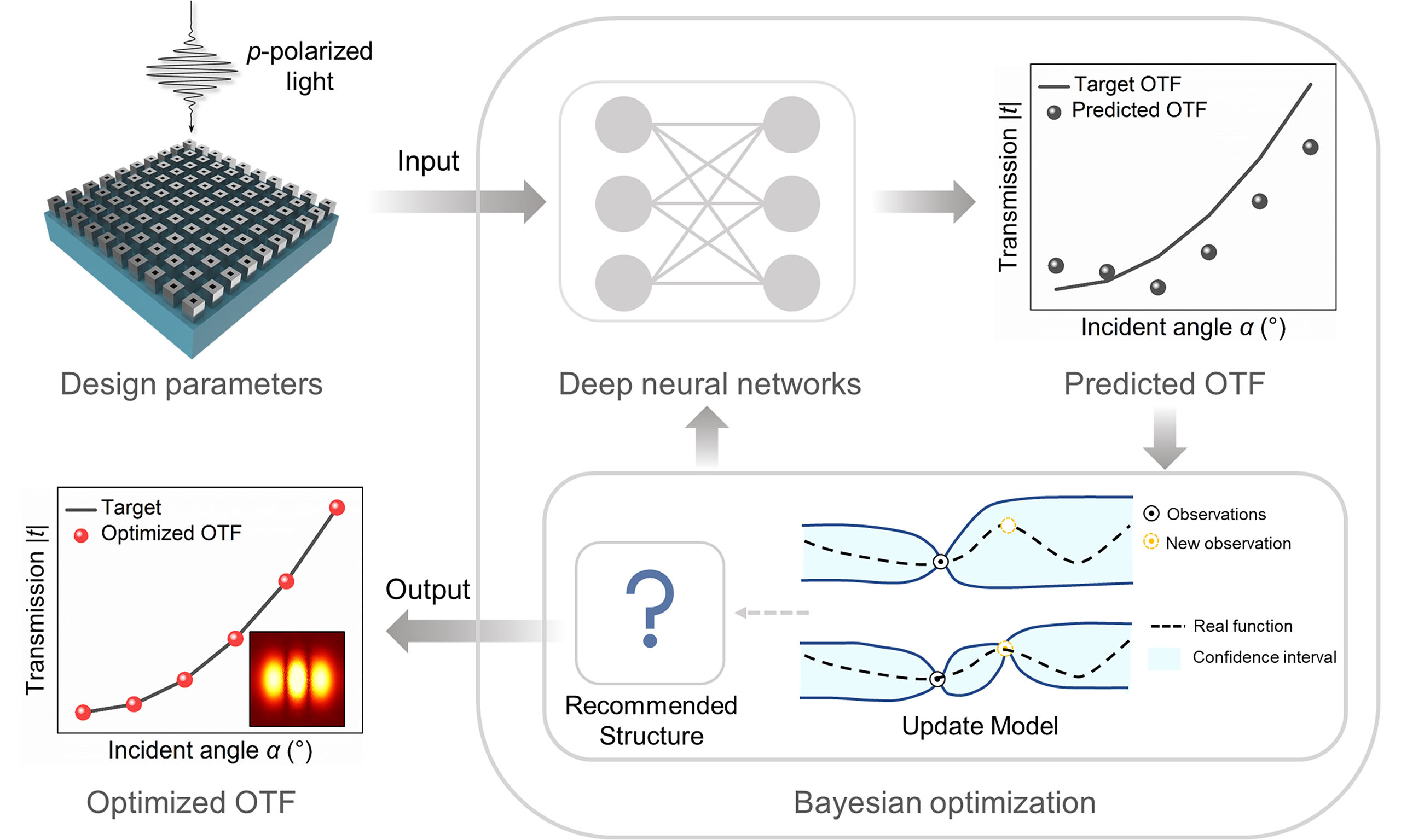 Figure 1. Schematics of the automated inverse design framework for tailoring the OTF of nonlocal metasurface. (A) Design parameters of the nonlocal metasurface. (B) Schematics of the DNN-based forward prediction model. (C) Predicted angular transmission spectrum of the nonlocal metasurface via DNN. (D) Schematics of the BO method. Recommended structural parameters from BO at fixed λ. (E) Optimized angular transmission spectrum of the nonlocal metasurface via BO.