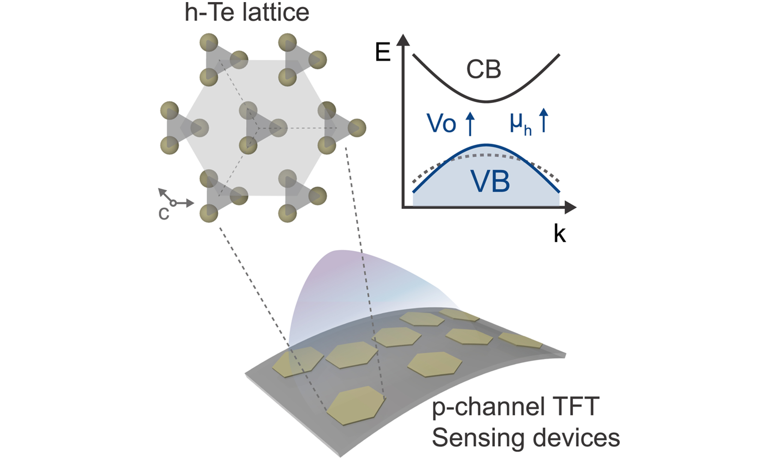 To address these limitations, tellurium (Te)-based oxides have recently emerged as promising alternatives, with expanding potential in flexible electronics, transparent circuits, and back-end-of-line (BEOL) compatible processes. This growing interest arises from their low processing temperature (< 400 °C), intrinsic p-type characteristics, excellent environmental stability, and diverse electronic and optical responses[3-5]. Structurally, Te consists of helical chains bound by Van der Waals (VdW) interactions; upon oxidation, it can form hexagonal or tetragonal crystal structures[6-9]. In particular, the hexagonal-symmetry packing of helical Te chains gives rise to a highly anisotropic lattice, enabling direction-dependent charge transport and preferred crystallographic growth directions[10-12]. At reduced dimensions, quantum confinement and control of thickness and diameter further enable band-structure engineering, which is difficult to realize in conventional oxide semiconductors[13-16]. Moreover, because dangling bonds are mainly confined to chain ends, non-radiative recombination is expected to be localized at specific edges, supporting suppressed surface recombination and longer carrier lifetimes[17,18]. Such properties have been successfully exploited in field-effect transistor (FET) fabrication, greatly enhancing their role as p-type semiconductor channels. Te-based FETs, owing to the helical chain-derived hexagonal structure, can form low Schottky barrier heights (SBH) that suppress off-state current and facilitate efficient hole injection[19-23].