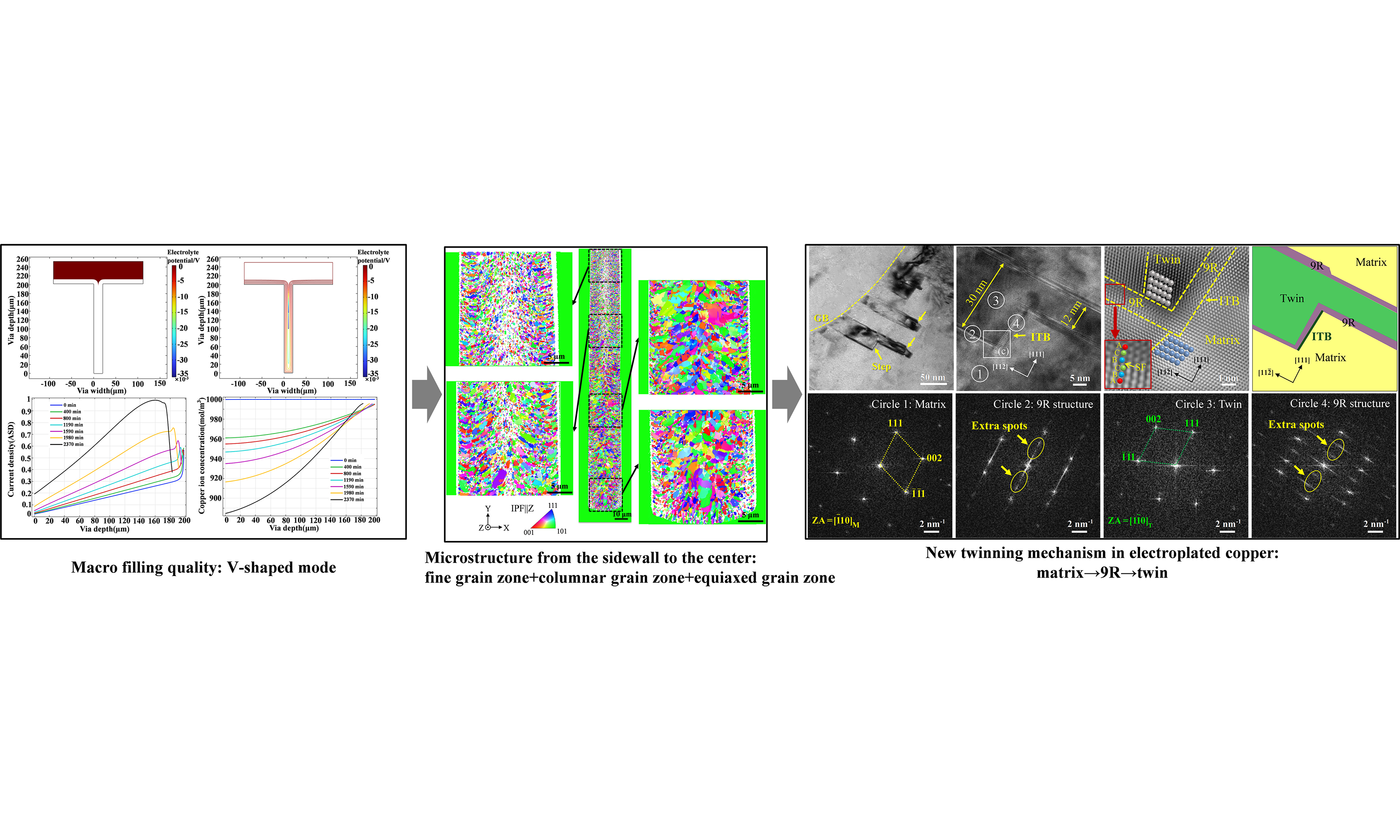 In the present work, the influence of applied current density on the deep TSV electroplated copper with a high aspect ratio of 10:1 and microstructure morphology of Cu are investigated using a combination method of numerical simulation (COMSOL Multiphysics field software) and electrodeposited experiment. A three-component model considering the additive systems (accelerator, suppressor) to simulate the TSV filling process at different current densities is established. And, electron backscatter diffraction (EBSD) characterization, focused ion beam/scanning electron microscopy (FIB/SEM), transmission Kikuchi diffraction (TKD) technology, and TEM are used to observe the evolution of twin and grain morphology. The matrix→9R→twin pathway is observed and discussed, and the reason for grain morphology evolution from column grain to equiaxed grain is revealed.