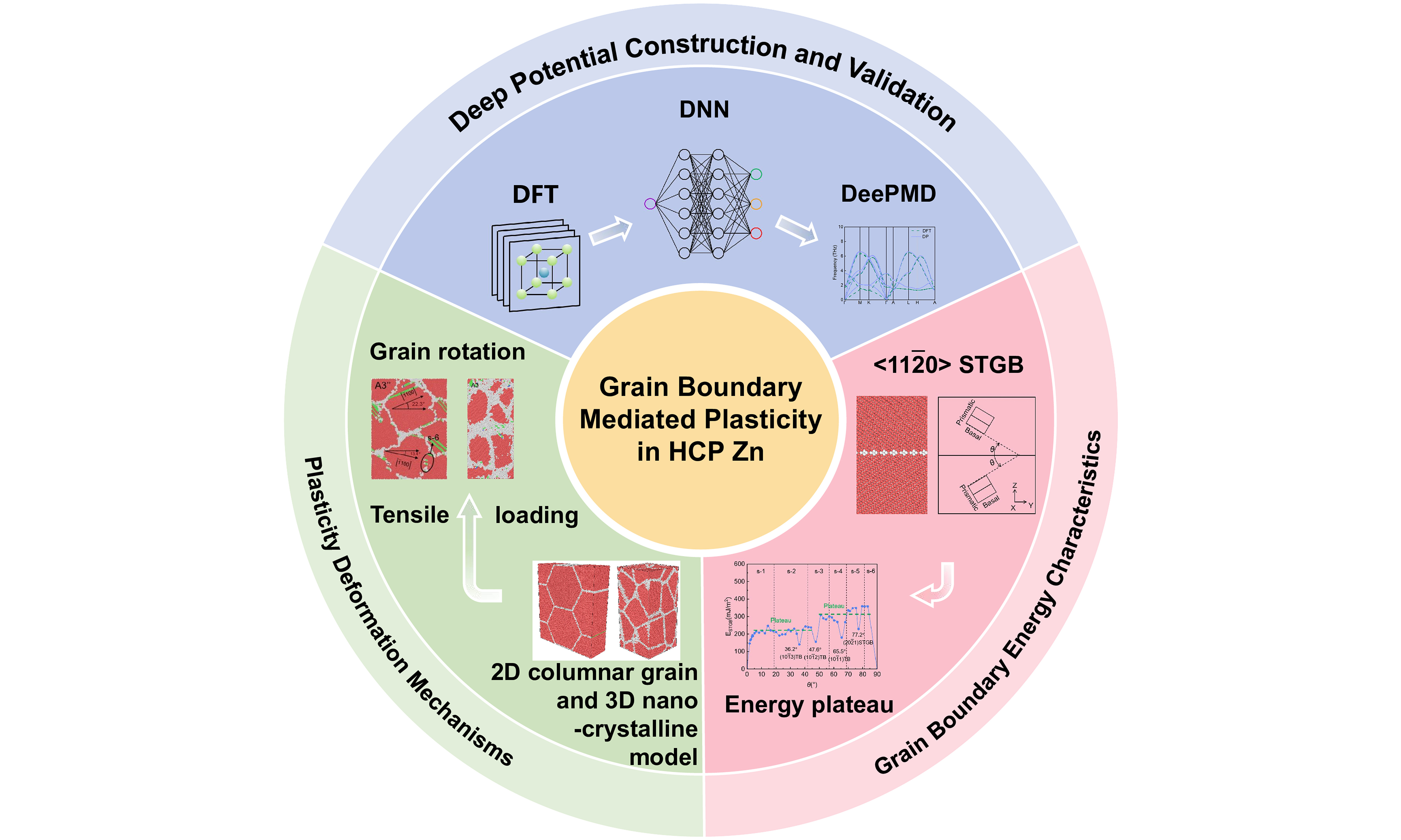 In summary, the developed DP model exhibits high fidelity in reproducing the fundamental properties of Zn, including lattice constants, elastic moduli, and phonon dispersion, showing excellent agreement with DFT data. Crucially, it accurately describes defect energetics such as surface, stacking fault, and GB energies, significantly outperforming the classical MEAM potential. This validates the DP model as a robust and reliable tool for the subsequent investigation of GB-mediated plasticity in Zn.