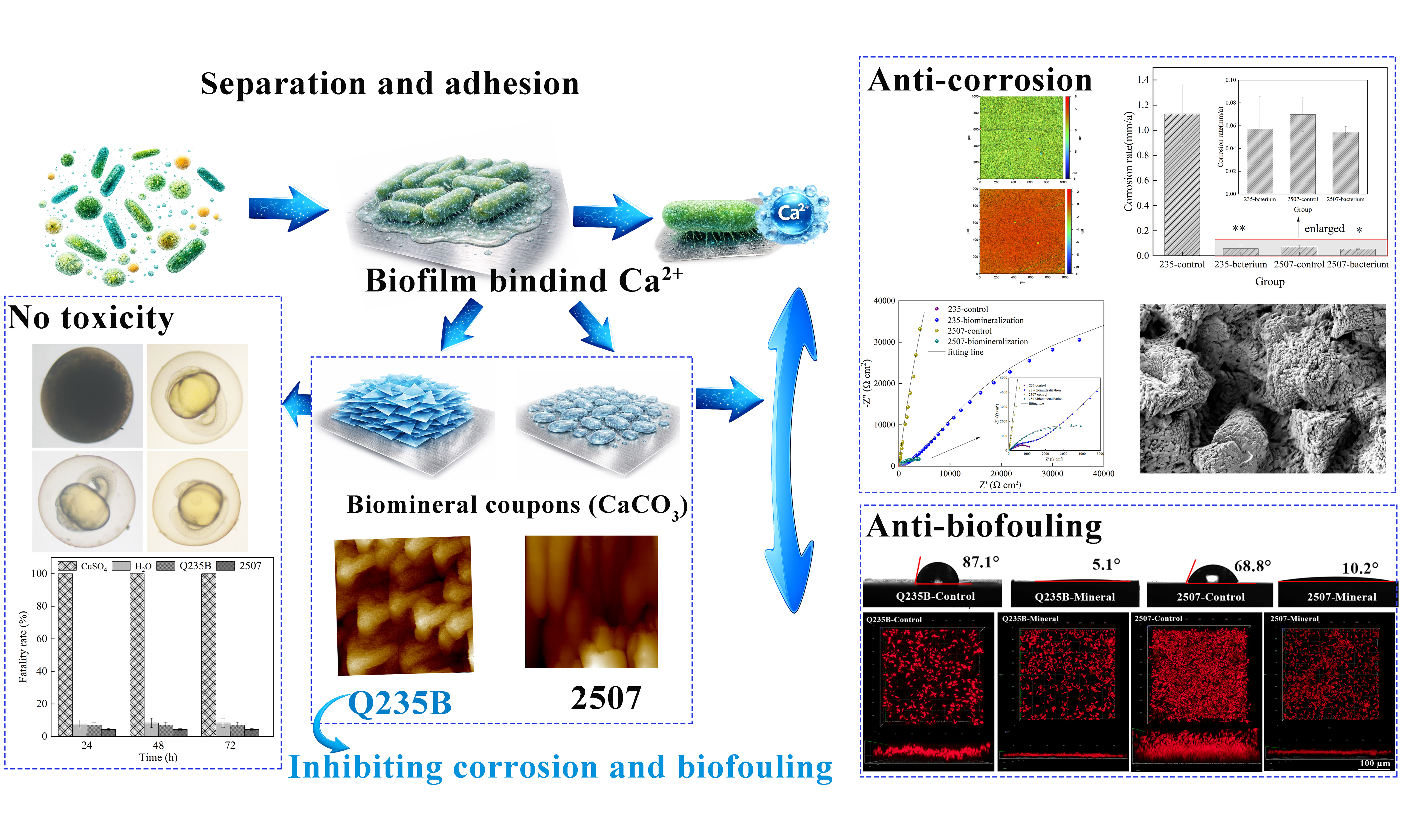 Metals used in offshore equipment operate continuously in high-salinity seawater and are prone to chemical and electrochemical attacks, which degrade performance and shorten service life. In particular, chloride ions (Cl-) promote localized corrosion that can perforate the metallic materials of ships, platforms, and subsea pipelines. Common marine alloys - such as copper, carbon steel, and high-manganese steels - are all susceptible to corrosion in seawater, resulting in major economic losses and safety risks[1-3]. Meanwhile, coastal eutrophication caused by industrial activities promotes bacterial and algal blooms, whose metabolites promote the formation of complex biofilms. Microorganisms, algae, and barnacles co-exist and stabilize these communities (marine biofouling)[4]. Biofilms establish oxygen gradients at the metal–water interface that accelerate electrochemical corrosion[5] and increase hydrodynamic drag (thereby raising fuel consumption and CO2 emissions)[6]. In addition, some organisms within biofilms can damage protective coatings via surface attacks or delamination[7]. Q235B carbon steel and 2507 duplex stainless steel are still widely used in marine applications, but both still corrode under harsh conditions[8,9], and microbial metabolites within biofilms can further initiate localized corrosion on Q235B and 2507 surfaces[10,11]. Historically, tributyltin (TBT) coatings provided strong biofouling resistance, but their ecological and human toxicity in marine environments were unacceptable, highlighting the urgent need for environmentally friendly strategies[12]. In recent years, some marine microorganisms have been shown to play dual roles in mitigating corrosion and biofouling by secreting extracellular polymeric substances (EPS) that chelate Ca2+/Mg2+ and promote protective biomineralization on metal surfaces. These biomineralized layers offered a promising green route to simultaneously inhibit corrosion and prevent biofouling.