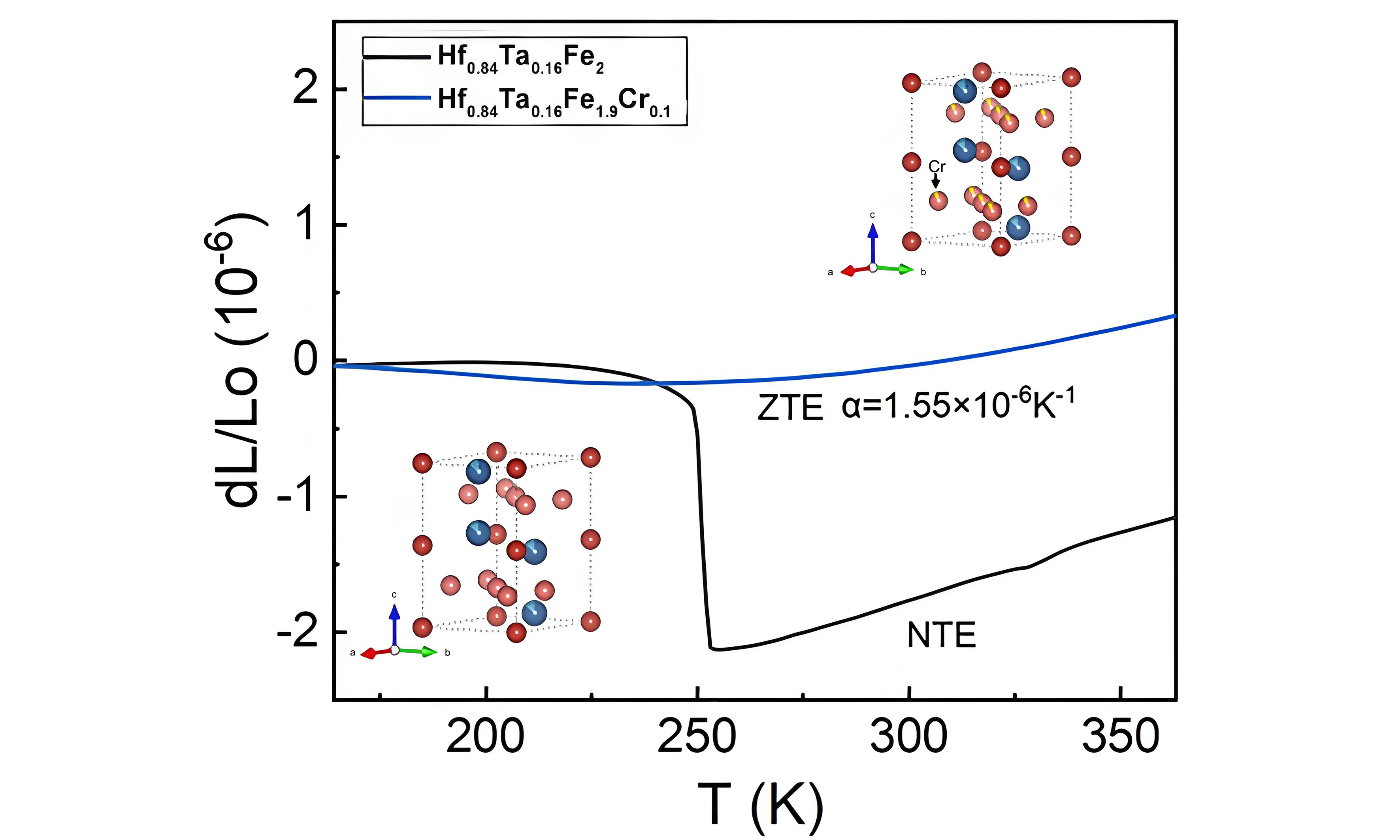 In summary, we developed a ZTE material with a thermal expansion coefficient of 1.55 × 10-6·K-1 and an operating temperature range covering room temperature (165-365 K). Our strategy to regulate the NTE of Hf0.84Ta0.16Fe2 involves chemical substitution and continuous optimization composition. The strong interaction between Fe atoms drives the NTE of Hf0.84Ta0.16Fe2. Introducing Cr atoms weakens the magnetic interaction between Fe atoms, reducing the extent of NTE. When the Cr content reaches 0.1, the weakened and decelerated interaction between Fe atoms in the ab plane delays the ferromagnetic transformation, leading to ZTE. This research expands the understanding of near-zero thermal expansion regulation in (Hf, Ta)Fe2 and highlights the potential applications of dimensionally stable materials over wide temperature ranges in advanced modern technologies[37].