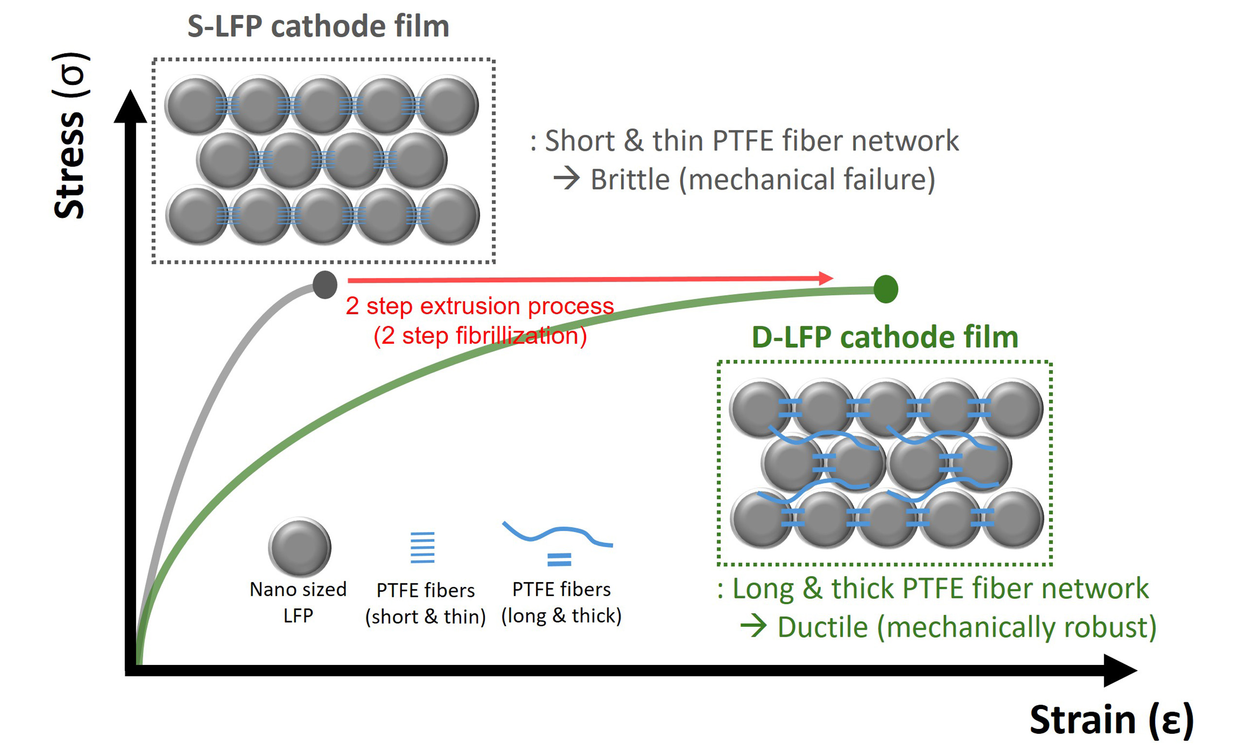 In this study, we investigated the fibrillization behavior of PTFE depending on the particle size of carbon-coated LFP, revealing that nano-sized LFP leads to the formation of thin and short PTFE fiber network, resulting in brittle and mechanically poor dry cathode films. To address this issue, we proposed a simple but effective two-step extrusion process to promote the formation of thick and long PTFE fiber networks within nano-sized LFP dry cathodes. In the 1st stage, a dry mixture of LFP, carbon nanotube (CNT), and PTFE were extruded and ground to produce 1st granules. Then, these 1st granules were subjected to a second extrusion with additional PTFE and CNT (2nd stage). During the second extrusion, the 1st granules acted as pseudo-large particles, facilitating the formation of thick and long PTFE fibers within nano-sized LFP dry cathode film. This thick and long PTFE fiber network improved the binding properties and thereby enhanced the flexibility and mechanical robustness of the nano-sized LFP dry cathode film. Using this approach, we successfully fabricated nano-sized LFP dry cathodes containing only 2 wt% PTFE binder, achieving both enhanced mechanical flexibility and microstructural stability. The improved mechanical integrity enabled the fabrication of thick LFP electrodes with high areal capacities, demonstrating their suitability for high-energy-density lithium-ion batteries. These results provide new insights into the mechanical failure mechanisms of nano-LFP dry electrodes and offer a scalable process engineering strategy for the development of next-generation, high-performance LFP-based LIBs.