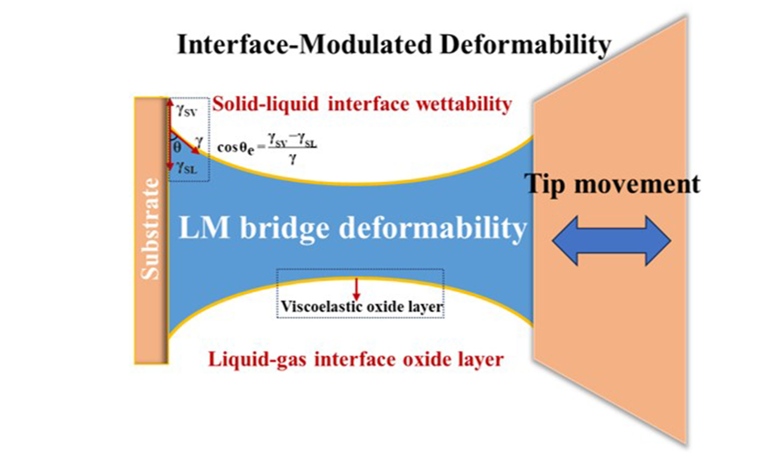 Figure 1A illustrates the construction of a typical flexible conductive circuit, where LM NDs dynamically reshape under deformation and form liquid bridges through interconnecting adjacent droplets, thereby establishing a continuous conductive network. The fluidity of LM bridges yields good stretchability while their rupture disrupts conductivity, making the stability of LM bridges a key factor for the performance of flexible electronics. The shape evolution of LM ND under applied stress is demonstrated in Figure 1B, highlighting the transition from initial droplet state to bridge formation and eventual separation during stretching. Multiple competing forces, including Laplace pressure, external stretching forces, and interfacial tension, govern this deformation process [Figure 1C]. Among these, solid-liquid interfacial tension and the associated wetting behavior obviously influence the elongation of LM bridges, which critically affects the mechanical and electrical stability. More importantly, the presence of an oxide layer at the surface (considered as a liquid-gas interface) of LM ND introduces further complexity to the dynamic evolution of LM bridges due to the influence of variation of surface tension and viscoelasticity. The oxide layer’s thickness and dynamic change determine whether it enhances bridge stretchability or restricts deformation by reducing LM’s fluidity. Therefore, key parameters including interfacial wettability, oxide layer properties, and force balance should be considered for precise control over the LM bridge in stretchable electronics.