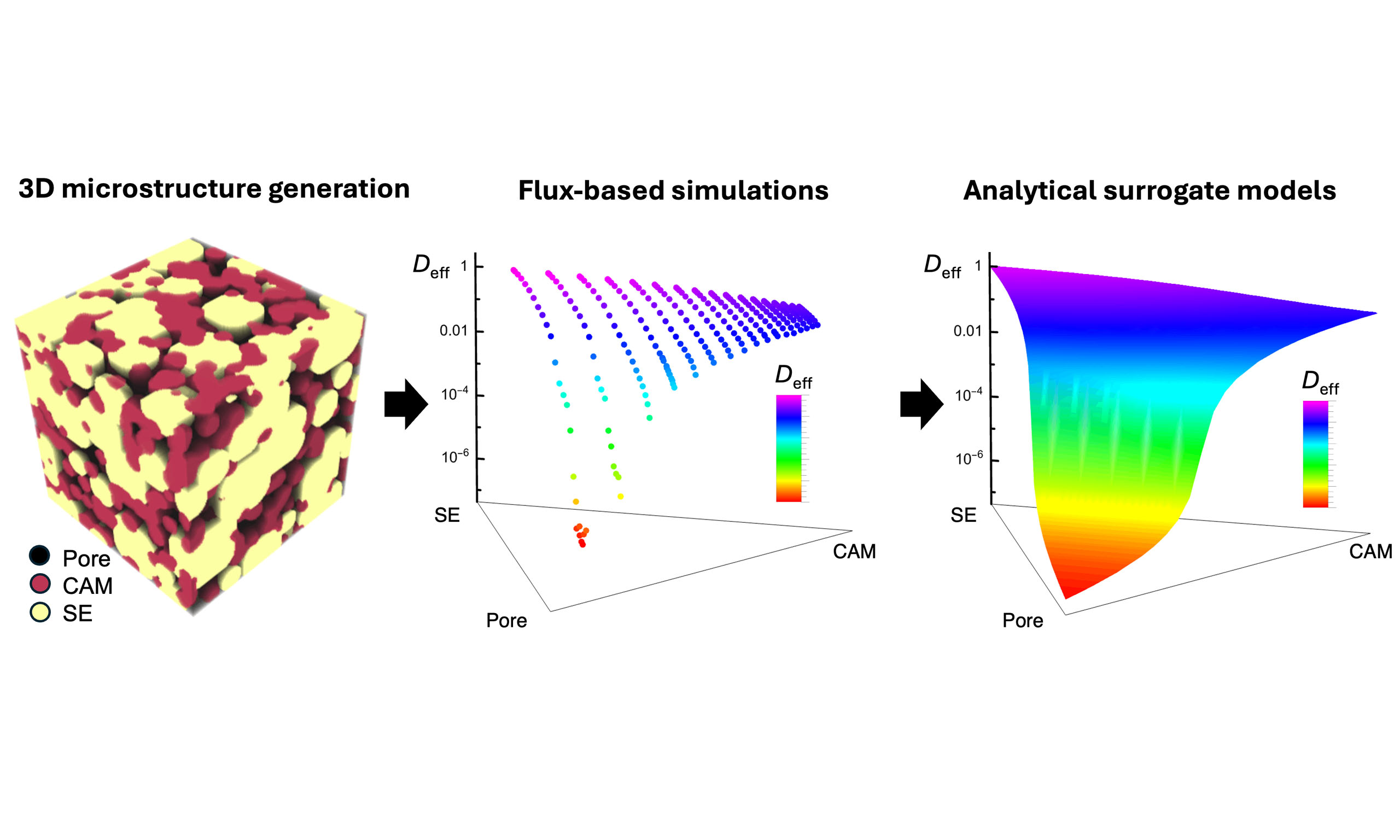A major innovation of this work lies in the application of a modified GEMT to describe three-phase transport behavior in solid-state cathodes. By introducing two independent percolation thresholds and scaling exponents, the proposed GEMT framework captures complex transport transitions between porous, CAM-rich, and SE-rich domains. Additionally, we also presented a surrogate model for the specific interface area based on the third-order Dirichlet distribution, enabling rapid and accurate estimation of interfacial area across ternary compositions. The surrogate models, once trained, serve as powerful tools to instantly evaluate effective properties, thus enabling multiscale integration and accelerating inverse design workflows. In practice, these surrogate models can be embedded into continuum-scale cell simulations as replacements for simplified homogenization rules such as the Bruggeman relation[61,62]. By supplying effective transport coefficients that explicitly account for phase diffusivities, percolation thresholds, and microstructure-dependent interface areas, the surrogate models can provide a more accurate link between particle-scale features and cell-level performance, thereby enhancing predictive capability in multiscale battery modeling [Supplementary Figure 6].