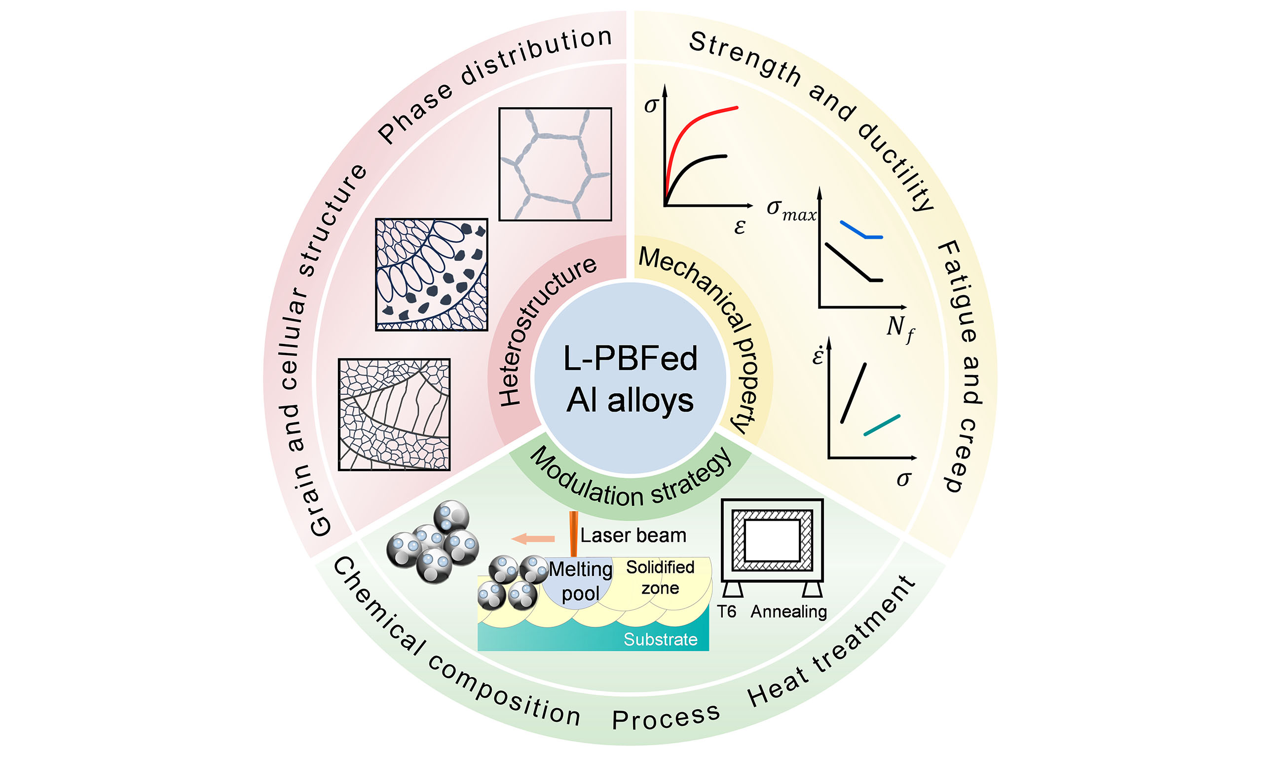 The emergence of additive manufacturing (AM) has revolutionized the fabrication of heterostructured Al alloys[28-30]. Laser powder bed fusion (L-PBF) technique, a prominent AM technique, stands out for its ability to produce near-net-shape components with complex geometries through layer-by-layer selective melting of metal powders[31-33]. By reducing the reliance on post-processing methods common in traditional machining, L-PBF has become an industry-standard technology[34]. Owing to rapid heating and cooling rates, as well as complex thermal gradients, the microstructures of Al alloys produced by L-PBF are unique compared to those obtained via casting, powder metallurgy, or other techniques[35,36]. The Gaussian energy distribution of the laser spot leads to distinct solidification conditions across different regions of the entire melt pool[37,38]. Furthermore, various solutes in Al alloys exhibit distinct solidification behaviors under rapid solidification, such as dendrite growth and segregation[39,40]. These characteristics, combined with the diverse family of Al alloys and the intricate interplay between laser parameters and powder composition, enable precise regulation over microstructural heterogeneity[41-43].