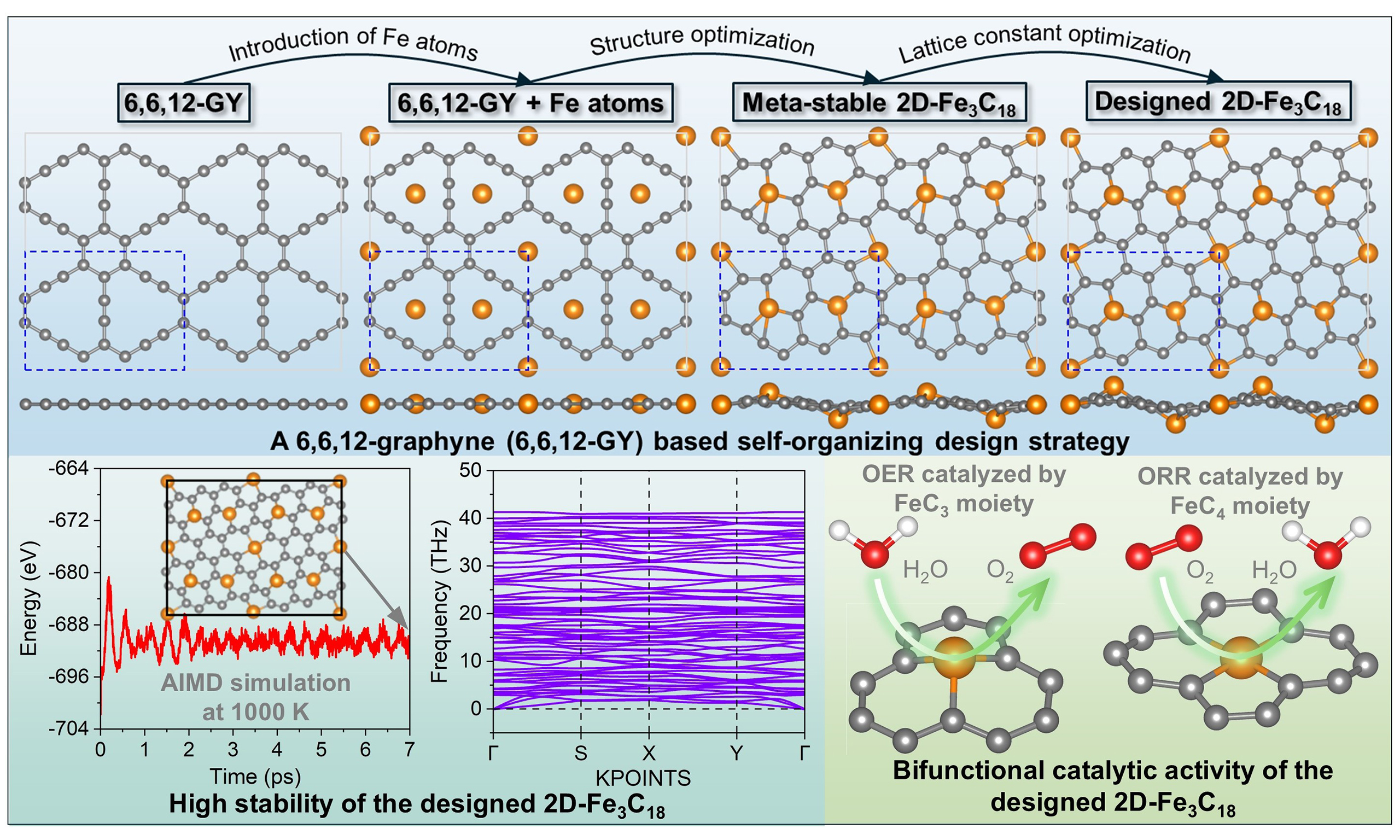 Figure 1. First-principles design of 2D-Fe3C18. (A) Schematic illustration of the 2D-Fe3C18 construction process, achieved by integrating Fe atoms with a 6,6,12-GY framework. The primitive cell is enclosed in blue dashed lines, with grey and orange balls representing C and Fe atoms, respectively. (B) Energy evolution during structure optimization (at 0 K) of “6,6,12-GY + Fe atoms” configuration with fixed lattices, leading to the formation of meta-stable 2D-Fe3C18. (C) Energy evolution during lattice constant optimization (at 0 K) of meta-stable 2D-Fe3C18, resulting in the generation of designed 2D-Fe3C18. (D) Structural schematic showing the origin of FeC3 and FeC4 moieties within the skeleton of the designed 2D-Fe3C18.