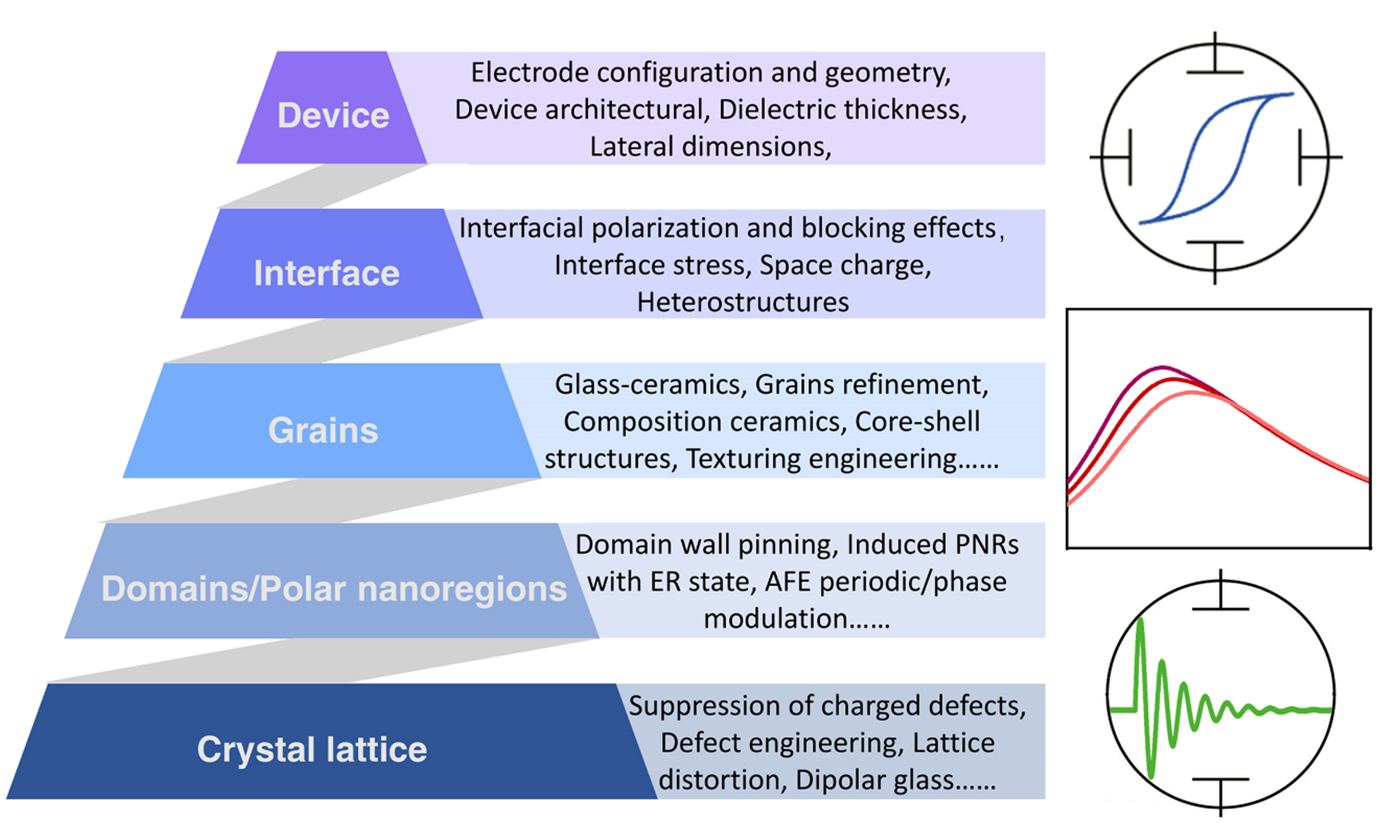 • Domain/microdomain/PNR scale: Describes the spatial organization and dynamic behavior of polar structures, ranging from micrometer-scale FE domains to nanoscale regions of correlated dipoles.