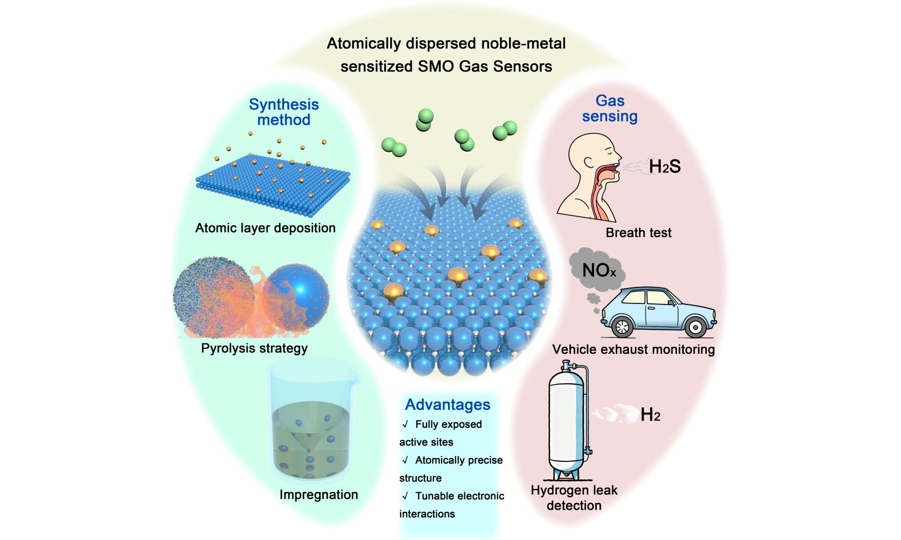 Atomically dispersed noble-metal-sensitized SMO materials have emerged as a highly promising platform for advanced gas sensing. Beyond traditional catalytic functions, each atomically dispersed noble metal serves as a well-defined sensitizer site, offering precise control over local coordination environments and electronic structures to modulate adsorption strength and gas selectivity. The strong metal-support interactions with SMOs facilitate efficient charge transfer and promote rapid signal transduction, leading to enhanced sensitivity and accelerated response speed. In addition, the atomically dispersed configuration inherently resists aggregation, thereby ensuring excellent thermal and structural stability under operating conditions. Collectively, these attributes enable atomically dispersed noble metals to function as efficient sensitizers, coupling catalytic activation with electronic modulation to achieve superior performance in sensitivity, selectivity, and durability compared to conventional noble-metal nanoparticle sensitized SMO materials. The following section provides a comprehensive overview of recent advances in this rapidly evolving field, with a focus on how atomic-level structural engineering governs gas-sensing behavior.
