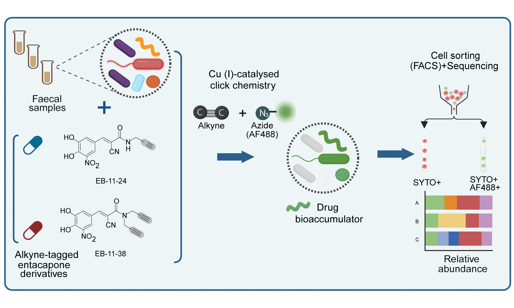 Methods: We synthesised alkyne-tagged derivatives of entacapone and evaluated their suitability as molecular probes in ex vivo incubations with faecal communities or different Escherichia coli (E. coli) strains. Following incubation, tagged drugs were conjugated to a fluorescently labelled azide via click chemistry. Labelled cells were visualised, quantified, sorted via fluorescence-activated cell sorting (FACS), and identified via 16S ribosomal RNA (rRNA) gene amplicon sequencing.