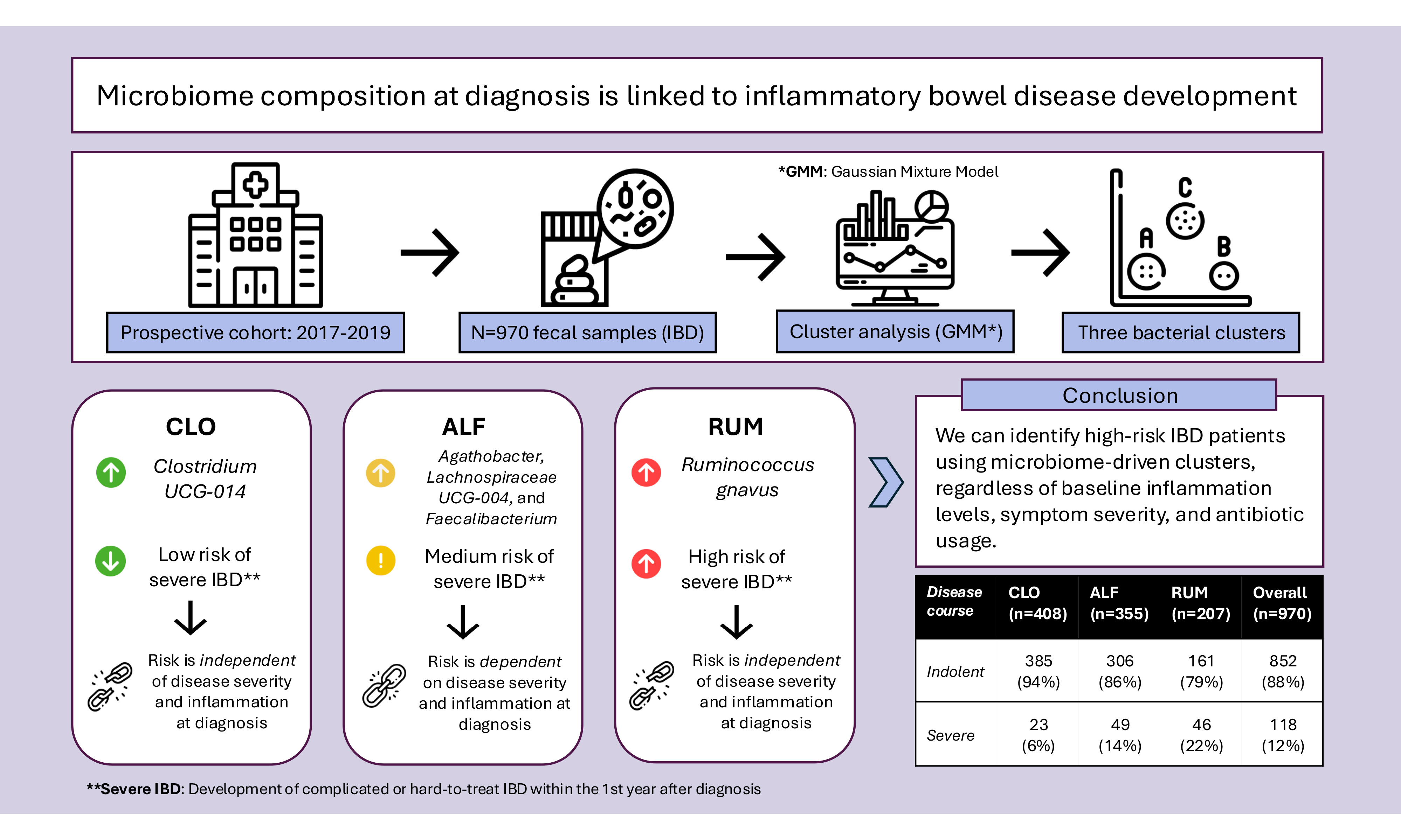 Conclusion: Our findings demonstrate a connection between microbiome composition and the risk of severe disease development, which is partly independent of inflammation levels at the time of sampling. Microbiome-informed subgrouping could lead to more personalized treatment strategies. Further validation is needed to determine the clinical utility of these clusters.