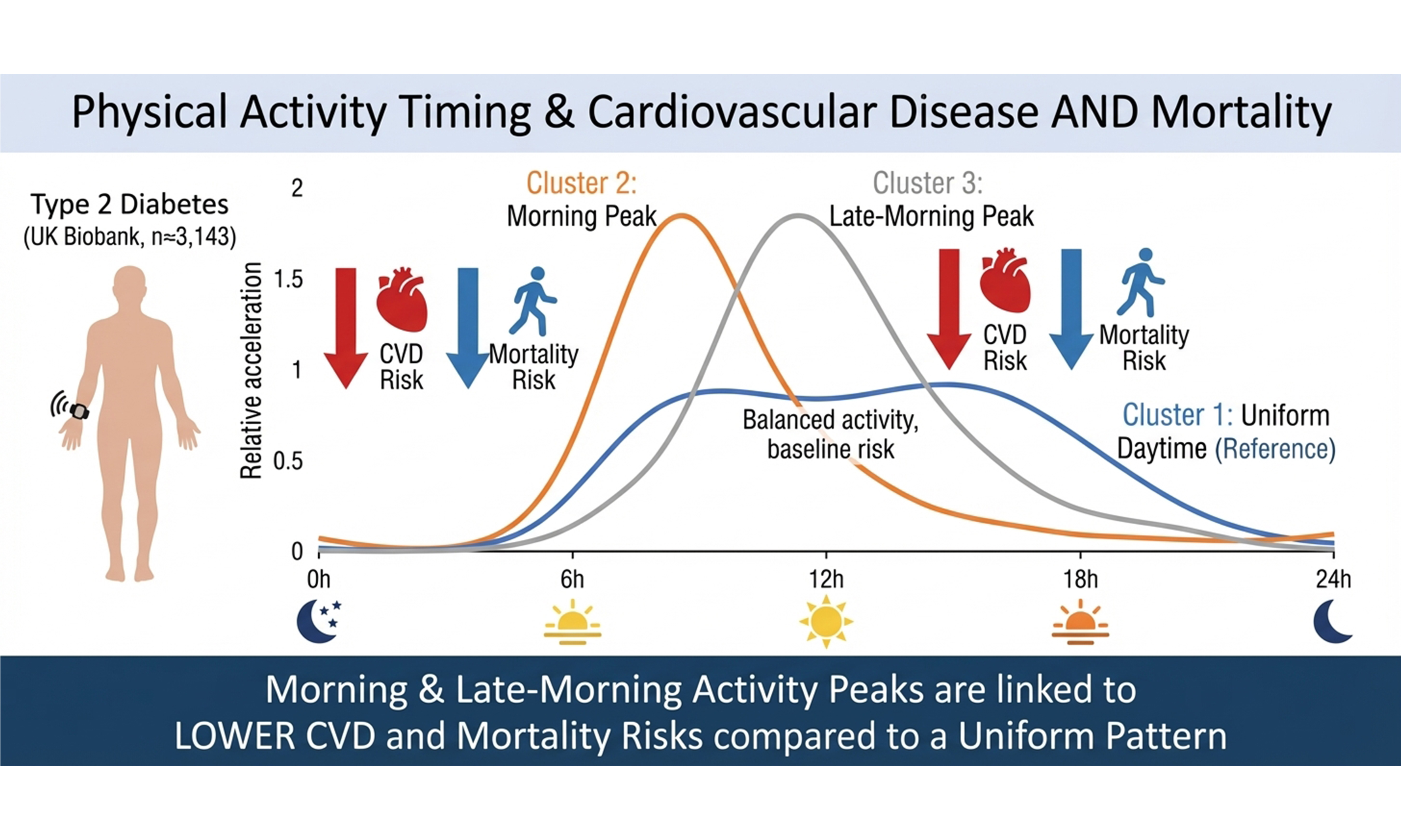 This prospective cohort study using data from the UK Biobank explored for the first time the relationship between the timing of PA and the risk of CVD and mortality in T2DM patients. In these patients, increased PA at around 8 am to 4 pm was associated with a reduced risk of CVD and cardiovascular mortality, while increased PA during the day and in the evening (but not in the early morning) was associated with a reduced risk of ACM. Increased PA in the early morning (especially around 3 am) was associated with an increased risk of CVD and death. This study identified three distinct groups according to their pattern of PA timing in patients with T2DM, characterized by either evenly distributed daytime activity, a peak in activity around