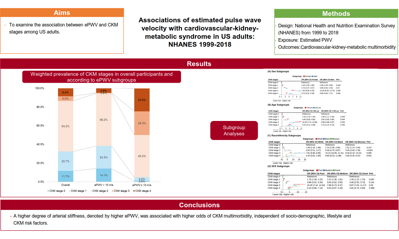 In this study, we aim to investigate the association between ePWV and stages of CKM multimorbidity among US adults using data from the National Health and Nutrition Examination Survey (NHANES).