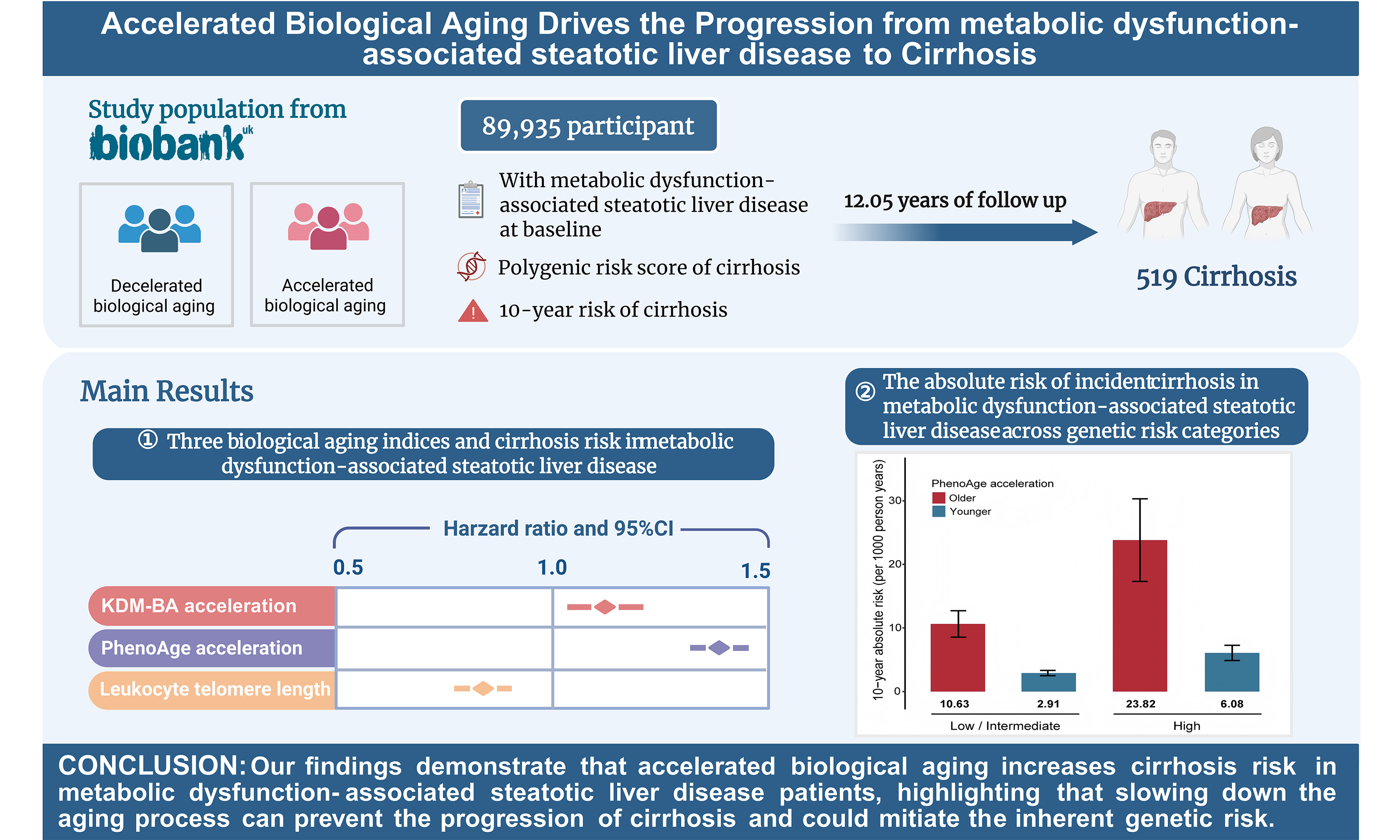 “In this prospective cohort study, using three BA indicators validated in the UK Biobank, we found that accelerated KDM-BA and PhenoAge, as well as shorter LTL, were significantly associated with an increased risk of MASLD-related cirrhosis. Furthermore, joint effects were observed between BA indicators and the genetic risk of cirrhosis. Notably, participants with the highest genetic risk showed the greatest 10-year absolute risk reduction for cirrhosis (17.74 per 1,000 person-years) when PhenoAge acceleration was lowered.
