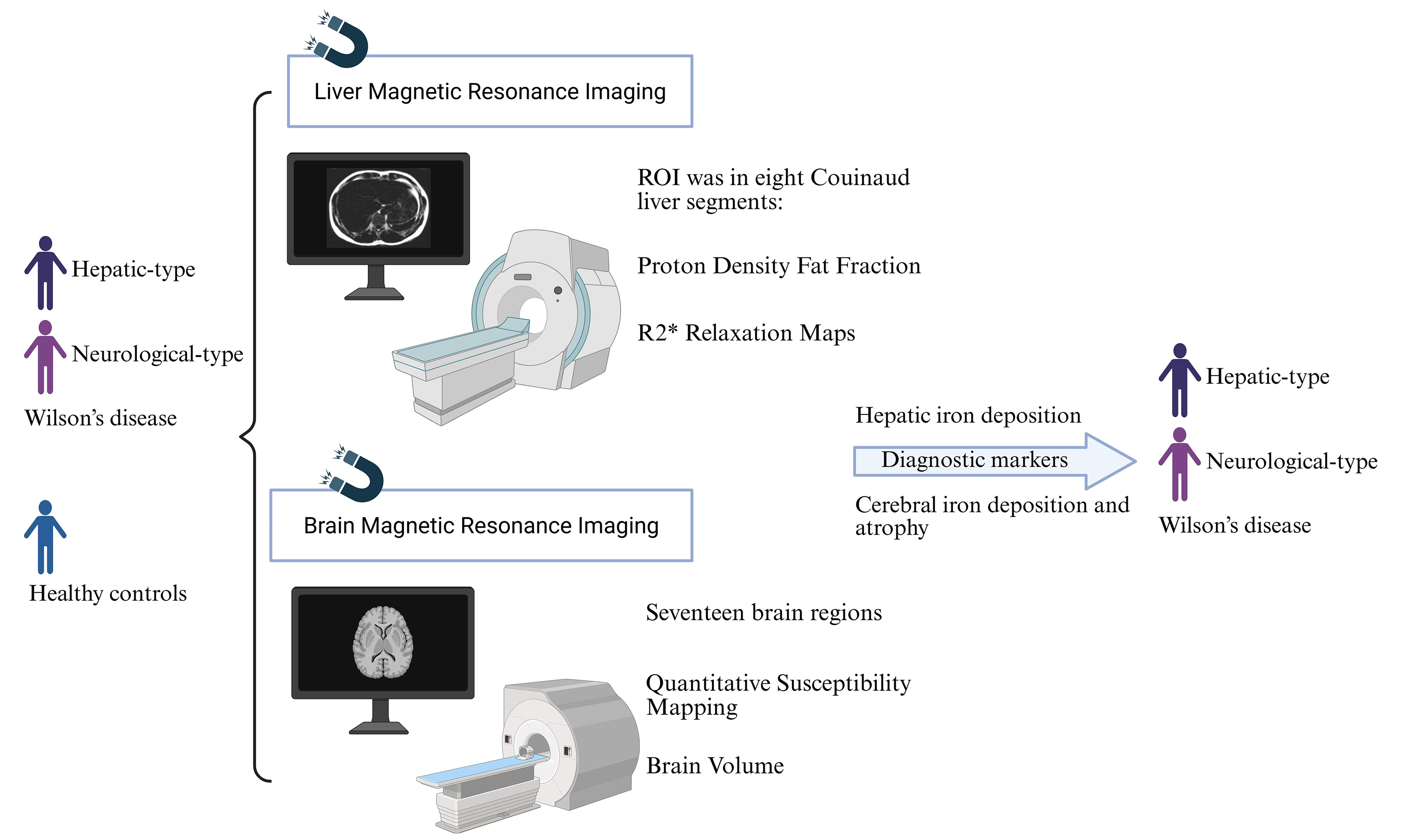 To address these issues, we systematically assessed the hepatic fat content, iron deposition in the liver and brain, and brain atrophy in patients with HWD and NWD through brain and liver MRI. Next, we analyzed the correlation between detection indices and neurological manifestations. Importantly, we screened the diagnostic indices for WD by LASSO (Least Absolute Shrinkage and Selection Operator) regression analysis, and evaluated their diagnostic power by receiver operating characteristic (ROC) analysis and area under the curve (AUC). This study integrates multimodal neuroimaging and hepatic imaging analysis and provides novel insights into the diagnosis and severity assessment of WD. Especially, our work contributes new and reliable evidence to refine clinical guidelines of WD.