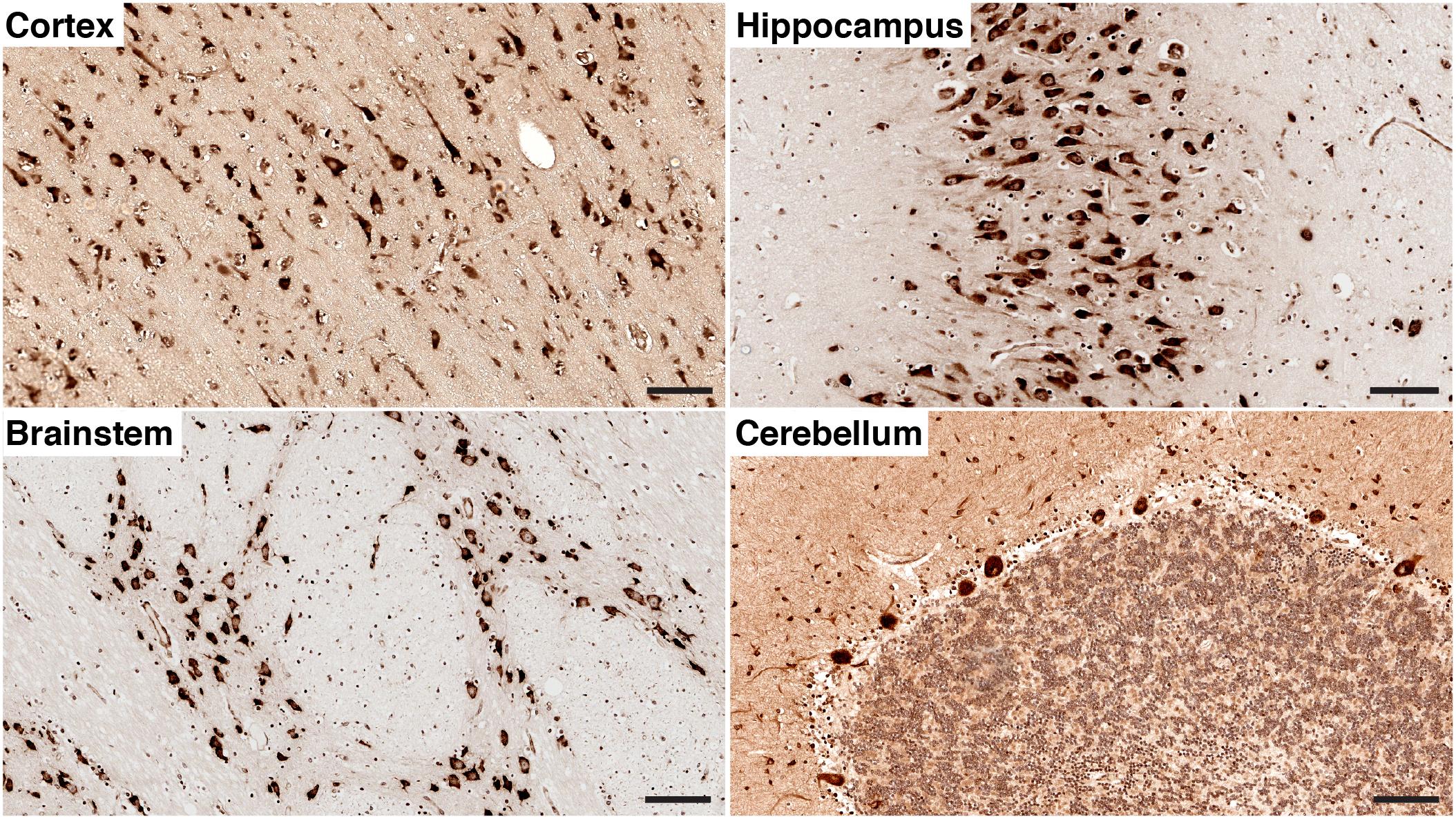 Figure 1. Representative immunofluorescent images showing co-labelling of AspRS (green) and the neuronal cell-type marker NeuN (magenta) in human post-mortem brain sections. Regions displayed include motor cortex, hippocampus, brainstem (pons), and cerebellum. Scale bar: 100 µm.